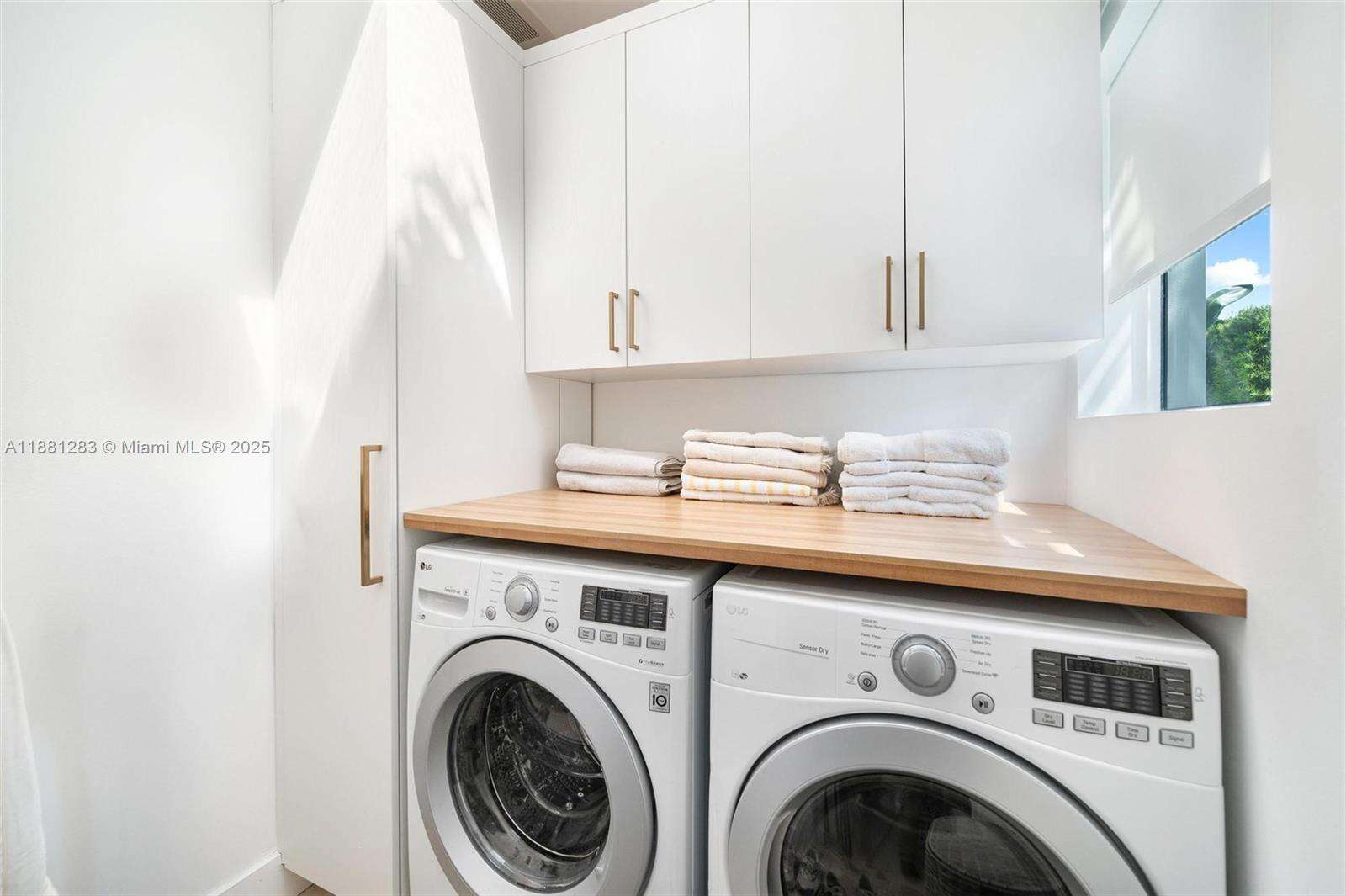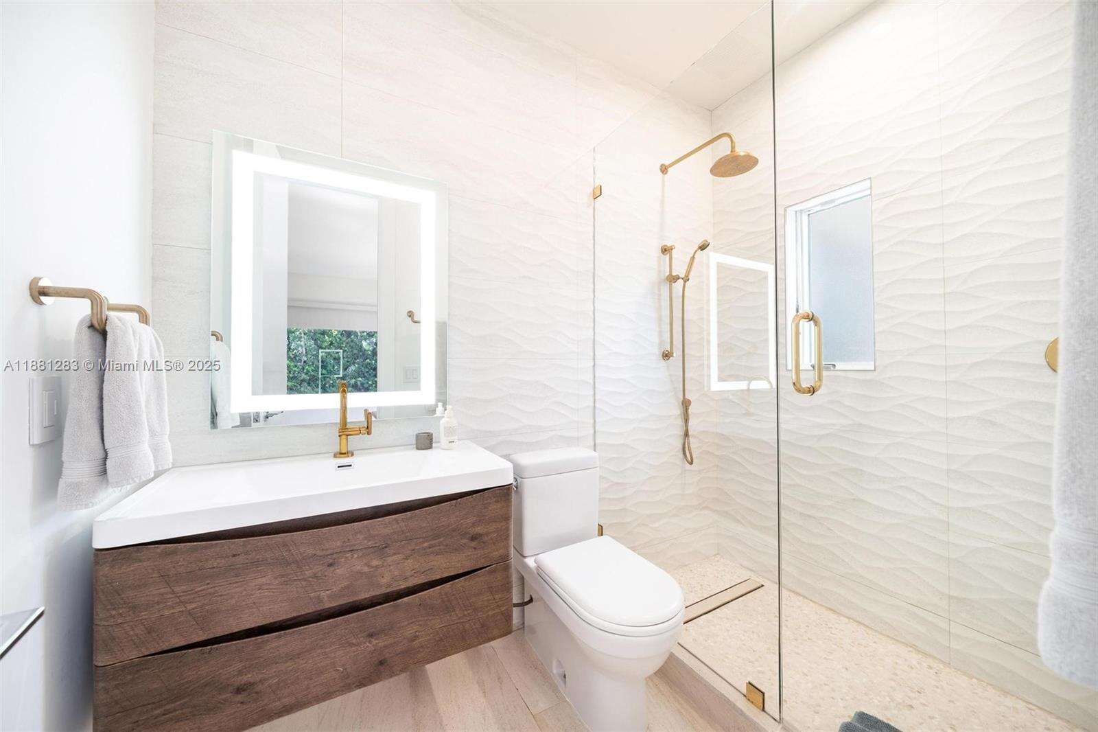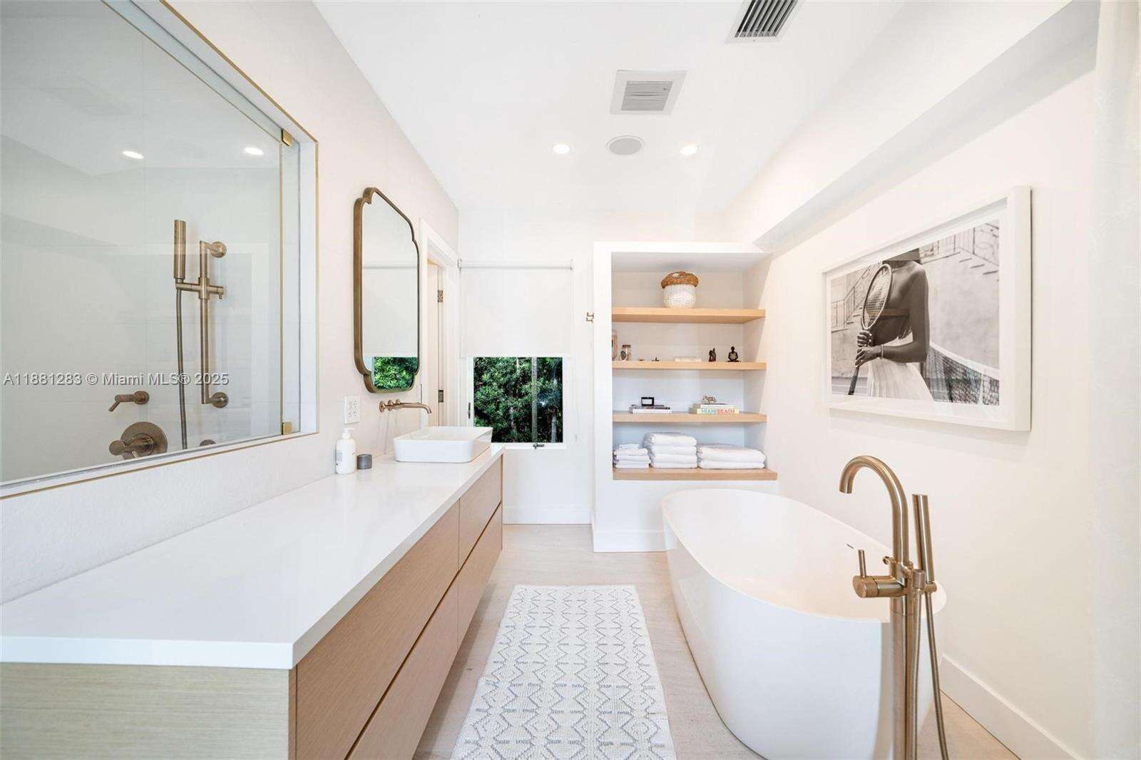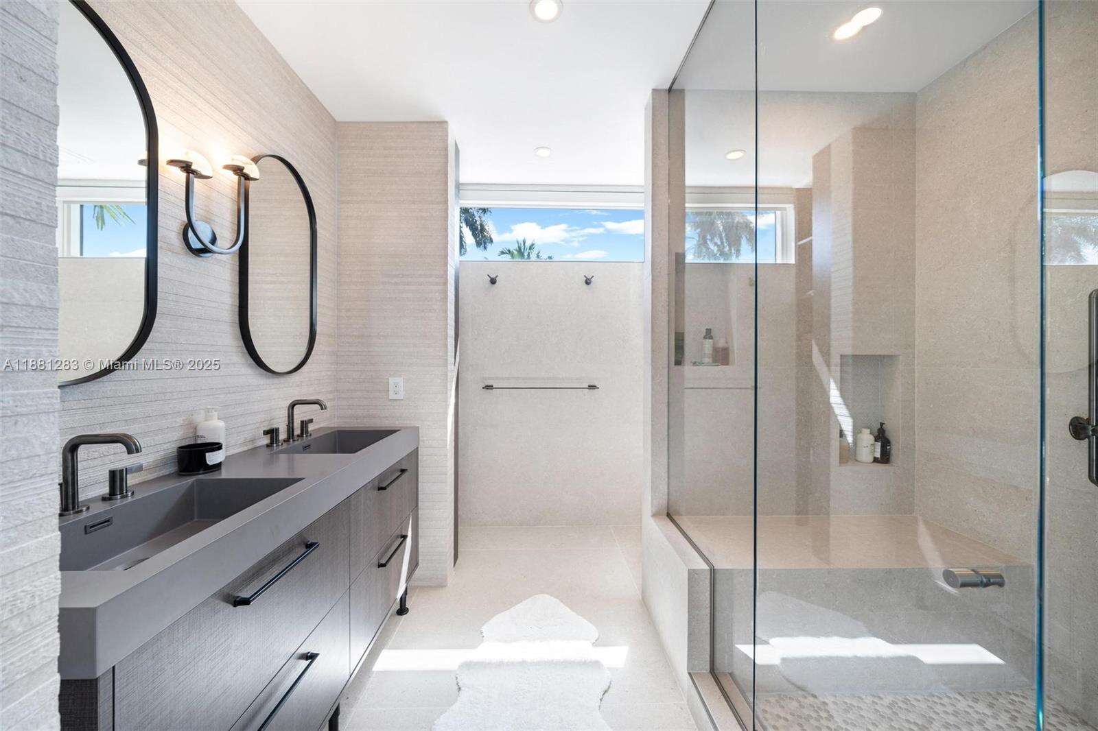 This 2-story mid-century modern home blends timeless design with contemporary upgrades on a private corner lot. A gated driveway offers secure parking for two, leading into expansive open living, dining, and kitchen spaces. All four bedrooms feature ensuite bathrooms, with master suites conveniently located upstairs and down. Modern comforts include electronic security, built-in surround sound, a whole-house generator, water filtration system, and three new A/C units. Outside, a saltwater pool and lush landscaping create a private retreat designed for today’s lifestyle.