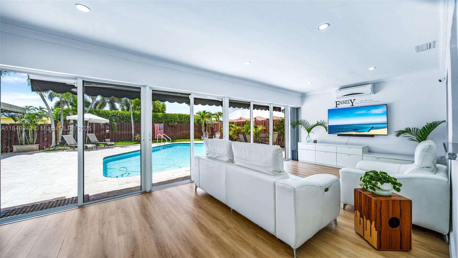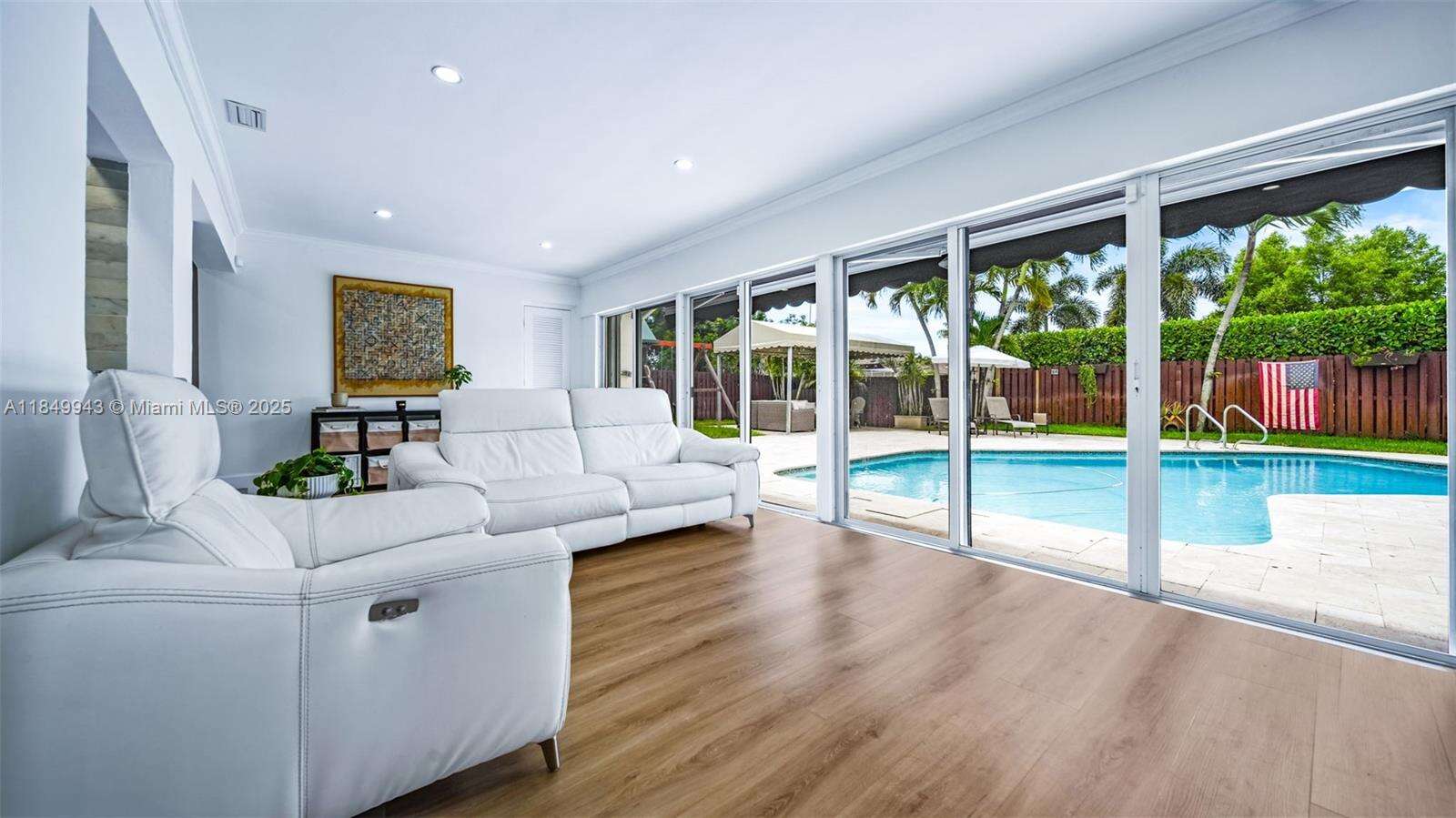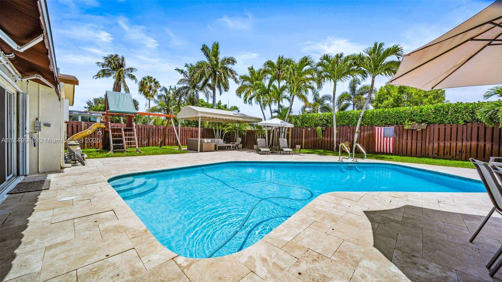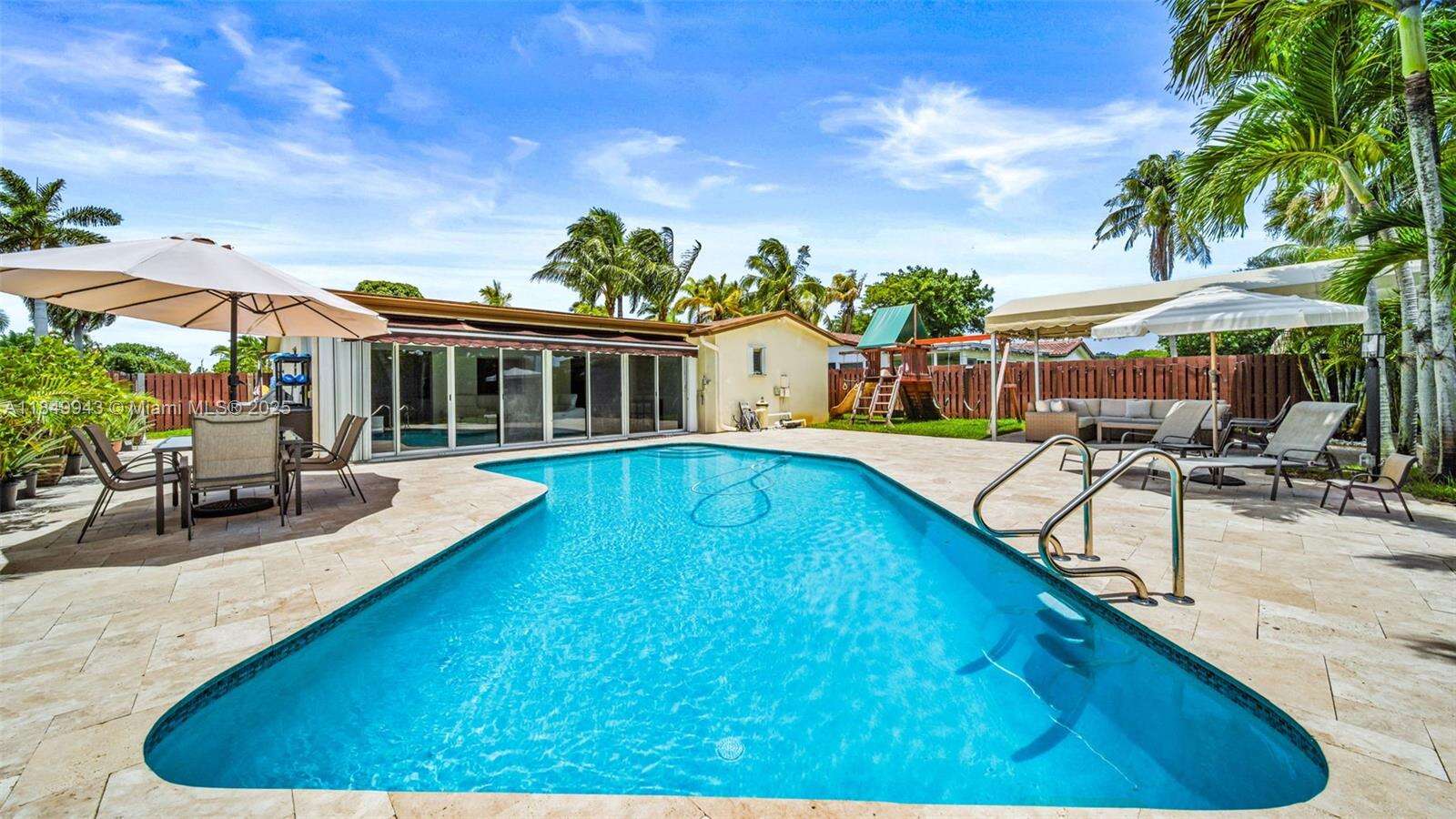 This 3-bed, 2-bath home in Hollywood Hills brings the Florida lifestyle to life. Step inside to an open, easy-flow layout with an updated kitchen and clean finishes—but the real magic is out back. Sliding doors open to a private tropical retreat with a sparkling pool and two shaded seating areas—one under a retractable awning, the other beneath a vinyl-topped frame—perfect for outdoor dining, relaxing, or weekend get-togethers. The enclosed garage adds flexibility—use it as an office, gym, or convert it back. Located near parks, top schools, shopping, major highways, and places of worship. Stylish, functional, and ready to welcome you home.