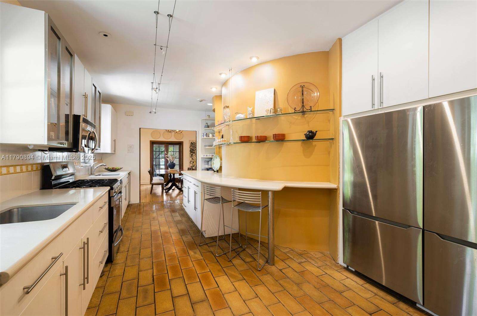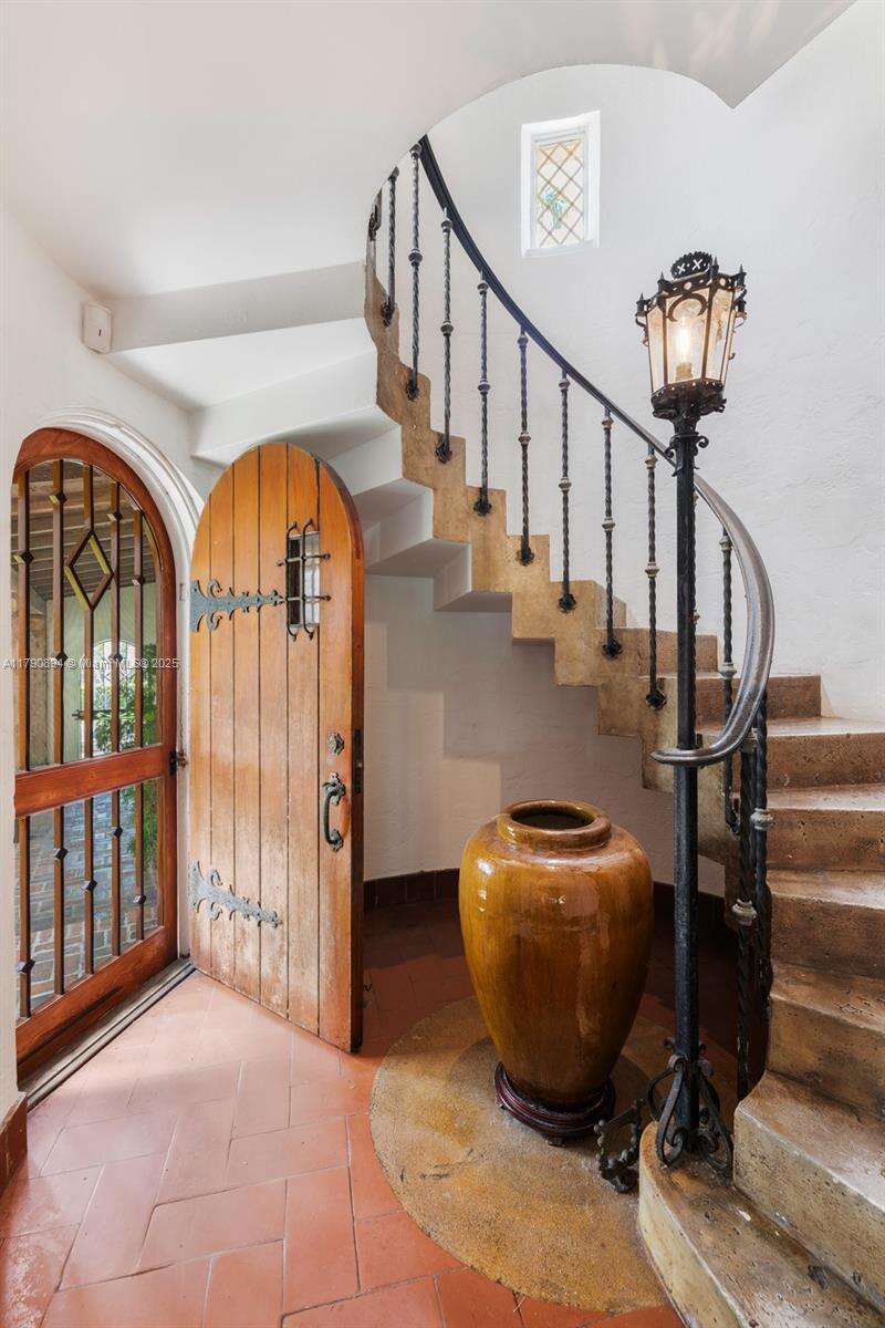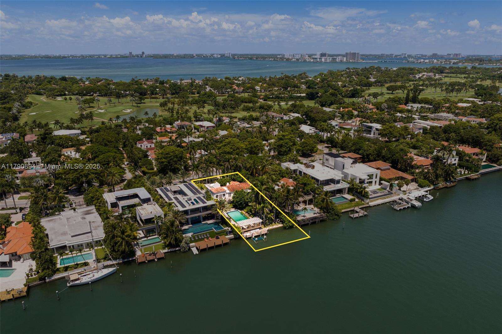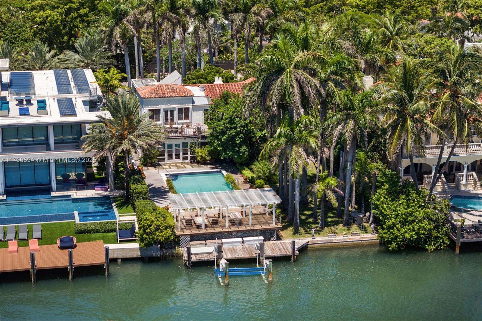 A rare opportunity on prestigious Pine Tree Drive: this oversized lot spans over 14,229 sq ft, perfect for boat lovers, fits 60’ boat, with 74 feet on the Indian Creek Waterway, offering sweeping views, ocean breezes, and privacy. This Spanish Mediterranean estate features 6 beds, 5 baths, a resort-style pool, a boat dock with lift, and no fixed bridges to the ocean—combining lifestyle, comfort, and elegance. The entire home was thoughtfully designed to orient each living space toward the water, maximizing the views throughout. The lush grounds, designed by famed landscape architect Dan Kiley, are adorned with royal palms. Inside, refined architectural details include a sculptural staircase, beamed ceilings, a great room, an enchanting courtyard, a loggia, and a sun-drenched Florida room.