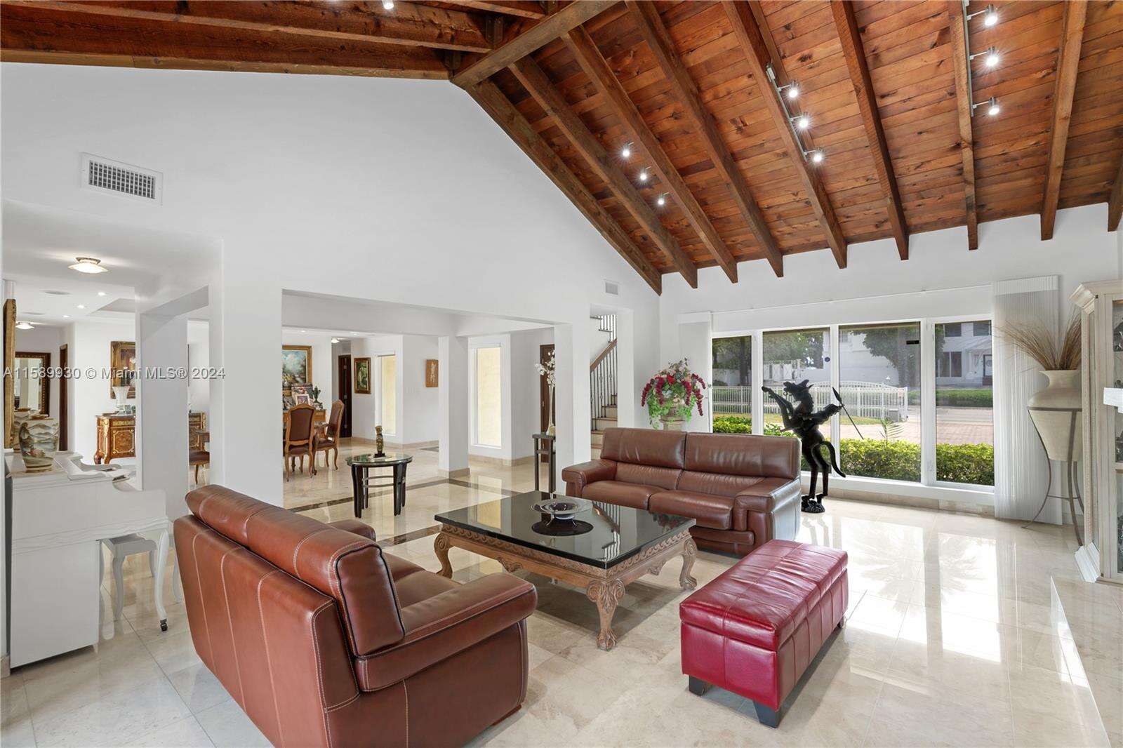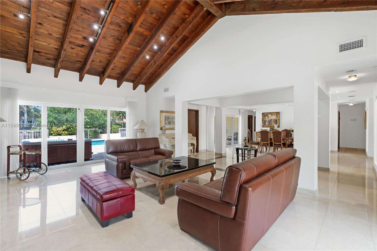 Nestled in the exclusive Golden Beach, this Mediterranean masterpiece exudes elegance and charm. A fusion of classic design and modern luxury, this 4-bedroom + study, 5-bathroom home offers a timeless allure. Remodeled in 2010, the residence features marble floors and bathrooms, impact windows, and vaulted ceilings that invite natural light and a feeling of spaciousness. The expansive 12,500 sq. ft. lot includes a stunning patio with an oversized pool, perfect for entertaining. Residents enjoy exclusive access to the private beach, tennis, basketball court, tot lot, and plans for a New wellness center/gym. Additionally having a private police force+++ makes this an unrivaled sanctuary.