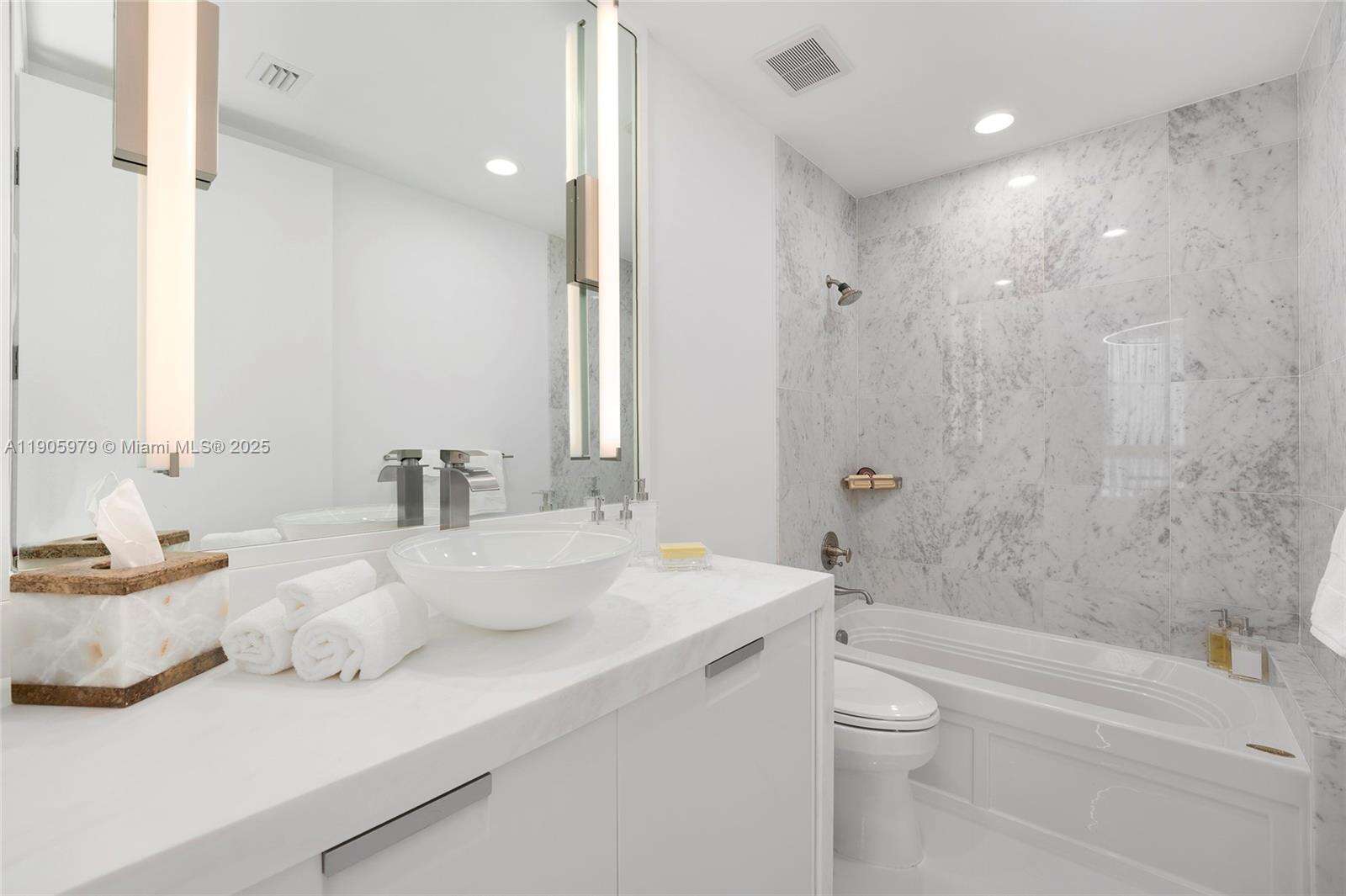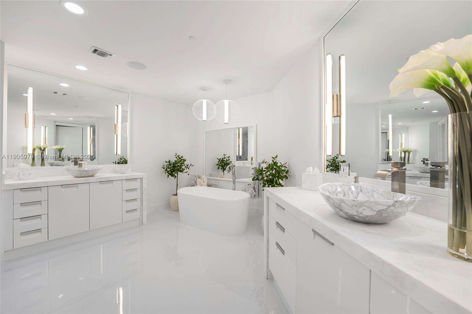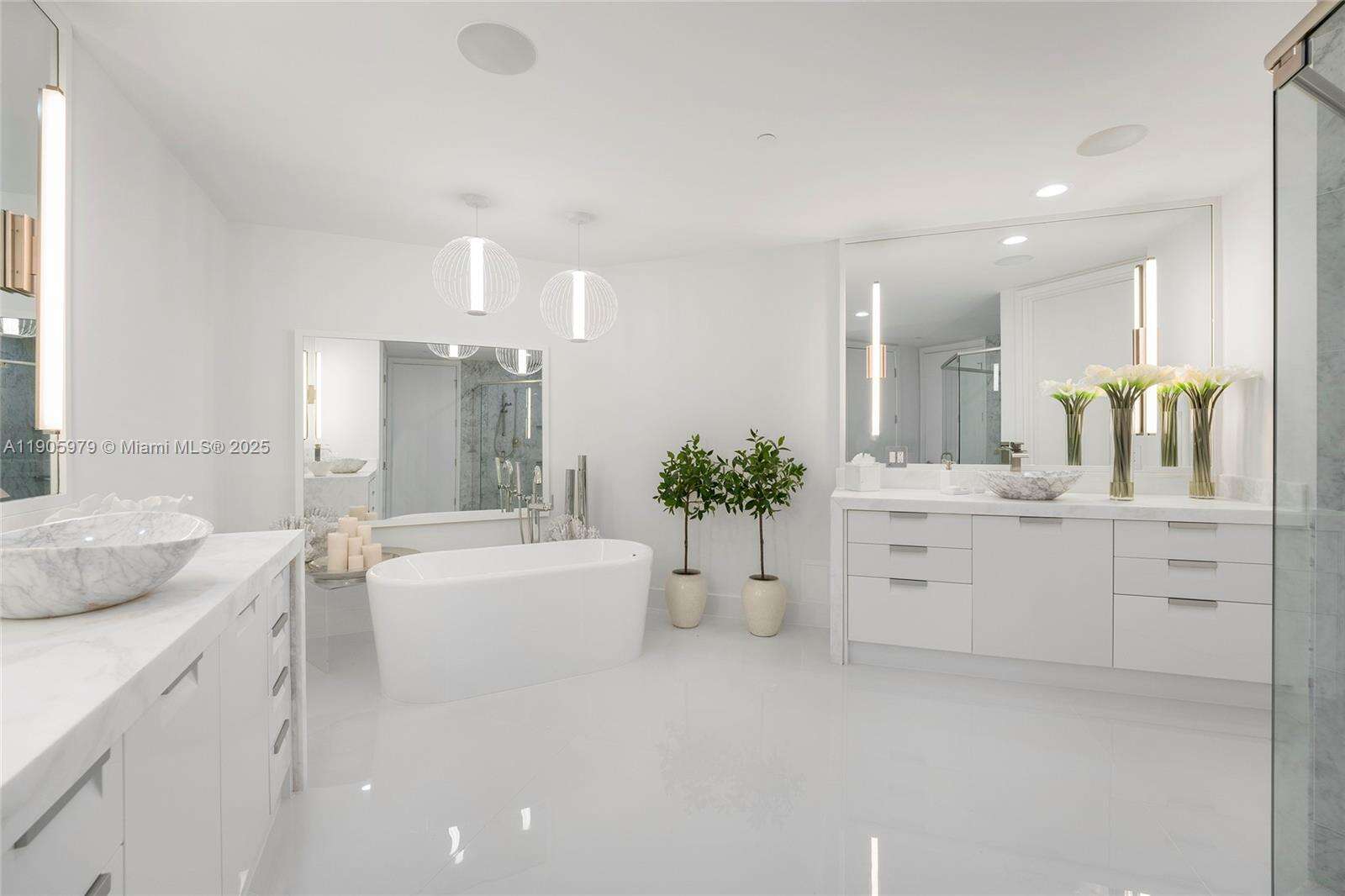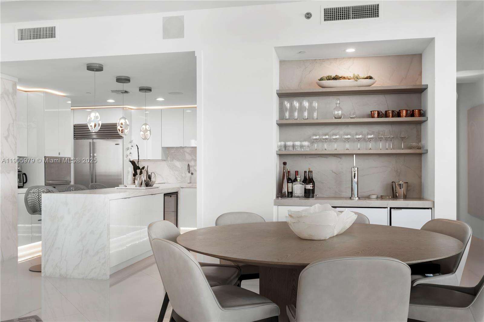 This contemporary oceanfront residence at the exclusive Bath Club defines modern coastal sophistication. Designed with clean lines and curated finishes, it’s offered fully furnished with top-tier electronics and designer pieces. Every detail exudes effortless style from marble surfaces throughout and porcelain flooring to custom ceramics and luxe textiles. Expansive ocean views fill every room, enhanced by integrated smart technology, surround sound, and ambient lighting. The showstopping marble kitchen features a sleek waterfall island, while the oceanfront primary suite offers a serene terrace, custom closets, and spa-like elegance. Residents enjoy five-star amenities including a private beach, full-service pool and cabanas, luxury spa, tennis courts, fitness center, and 24hr concierge.