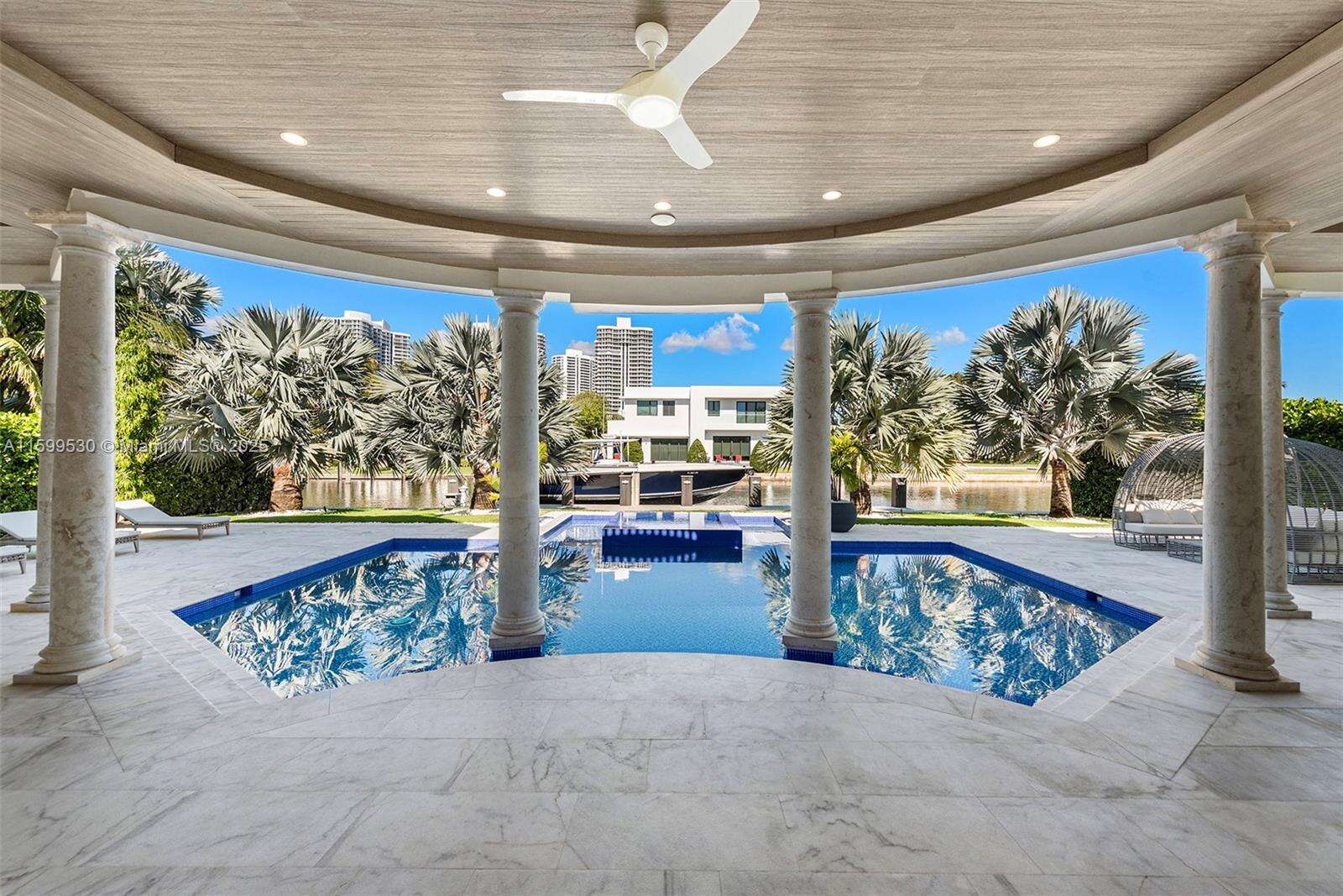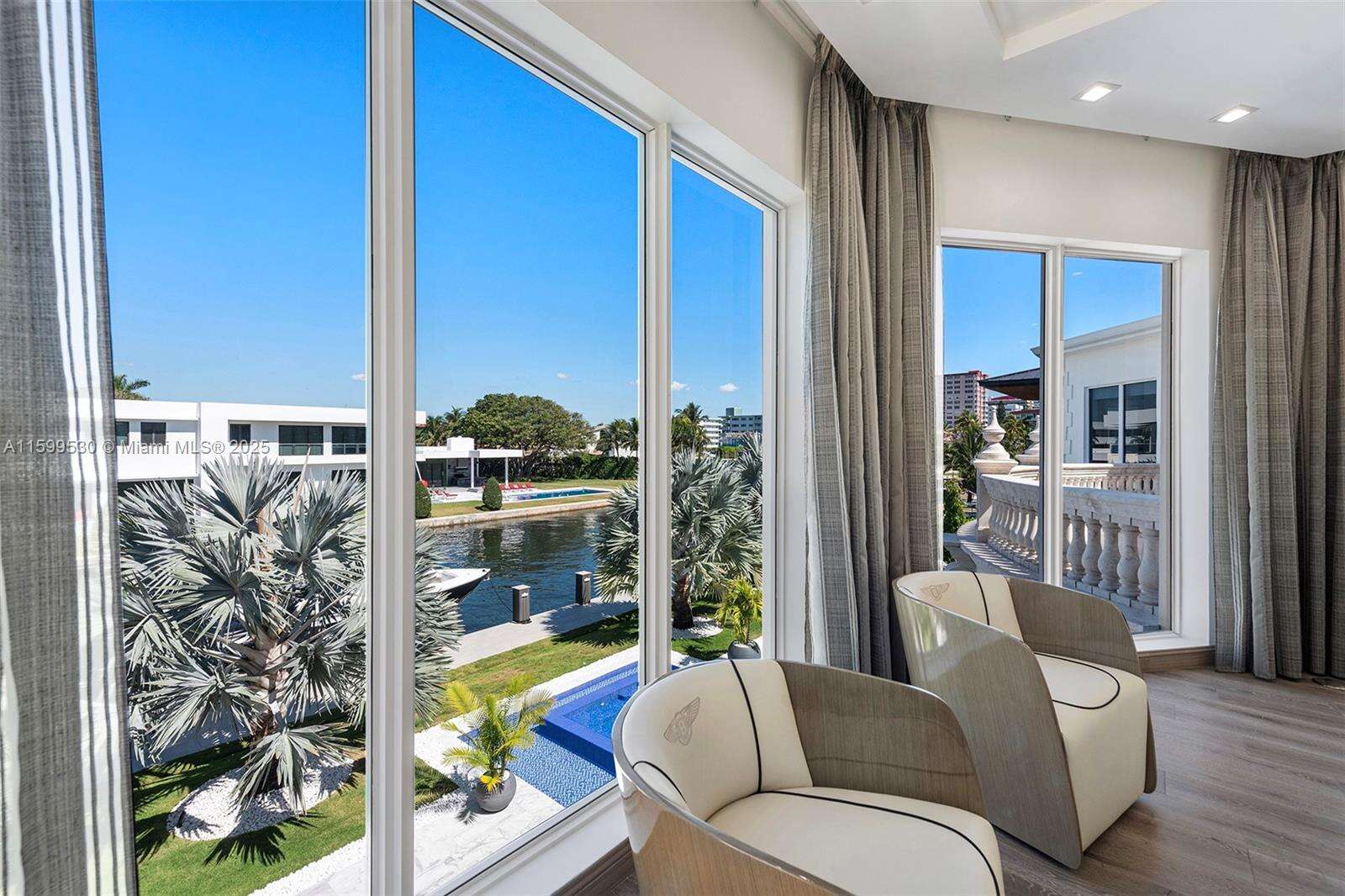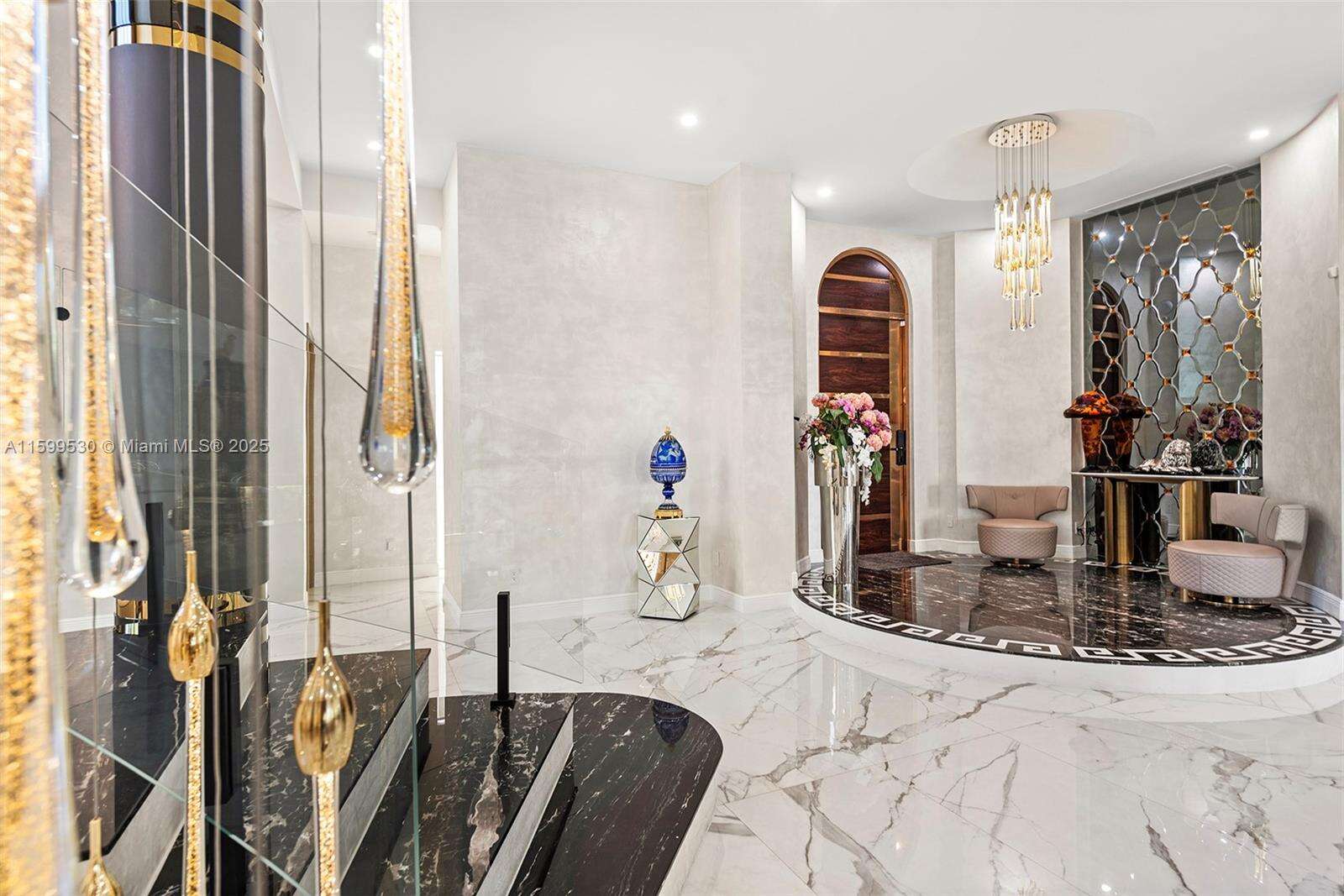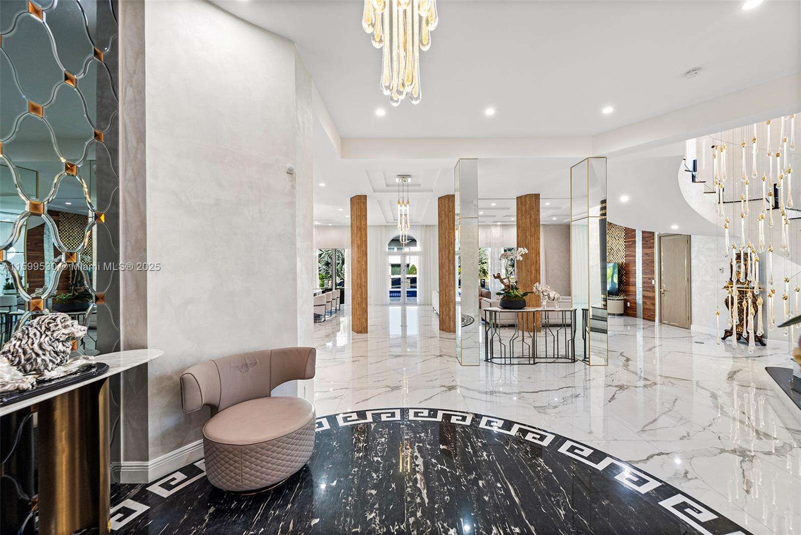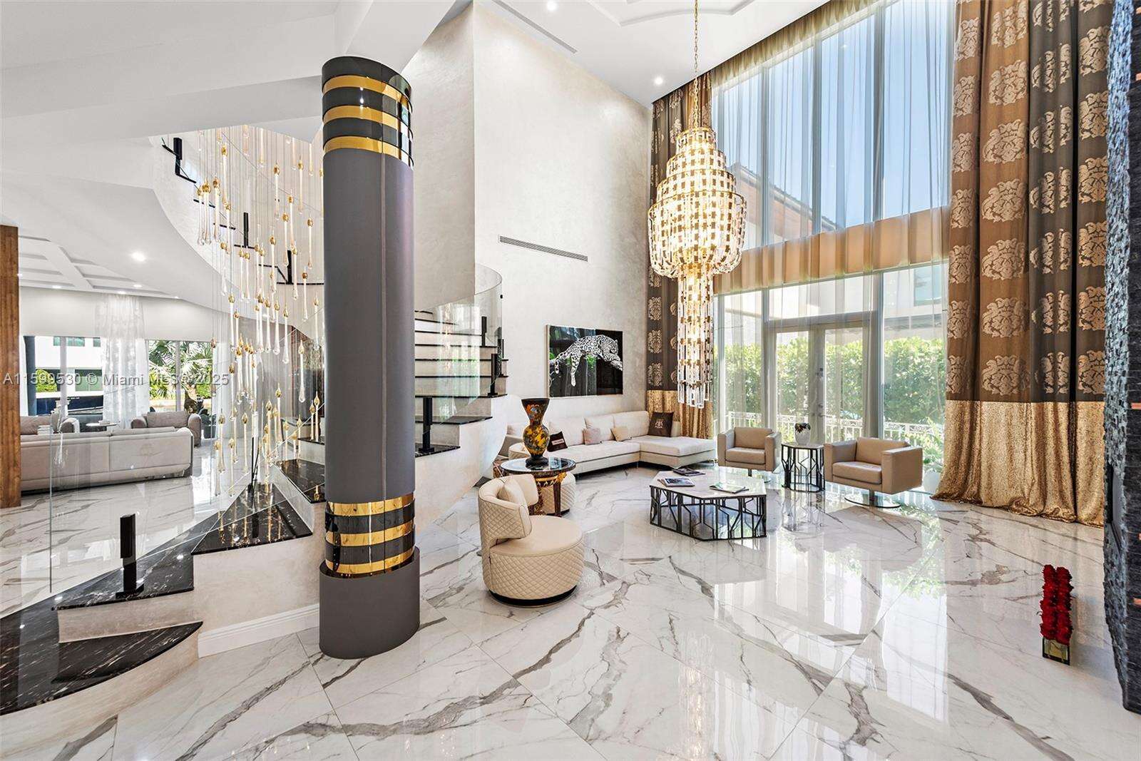Welcome to a new-age castle in Golden Beach, a newly built custom waterfront masterpiece. This home boasts massive ceilings and a well-thought-out design with handpicked European materials and finishes. Enjoy 100 feet of private water frontage, no fixed bridges, and easy ocean access. This smart home includes an extra generator and is an entertainer's dream with open spaces featuring 13-foot ceilings, a chef's kitchen, home theater, game room, living room fireplace, built-in patio barbecue, and custom saltwater pool with jacuzzi. The primary bedroom offers a balcony, dual walk-in closets and bathrooms, and an office space. Guest bedrooms feature walk-in closets, balconies, and en-suite bathrooms. Fully furnished with Fendi, Bentley, and Visionnaire furniture.