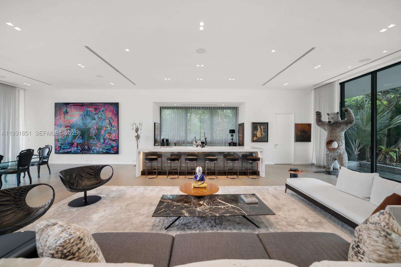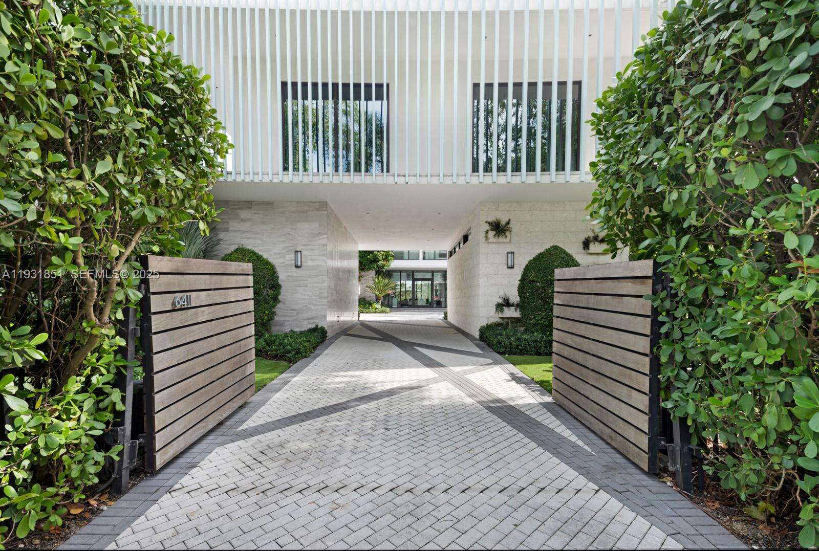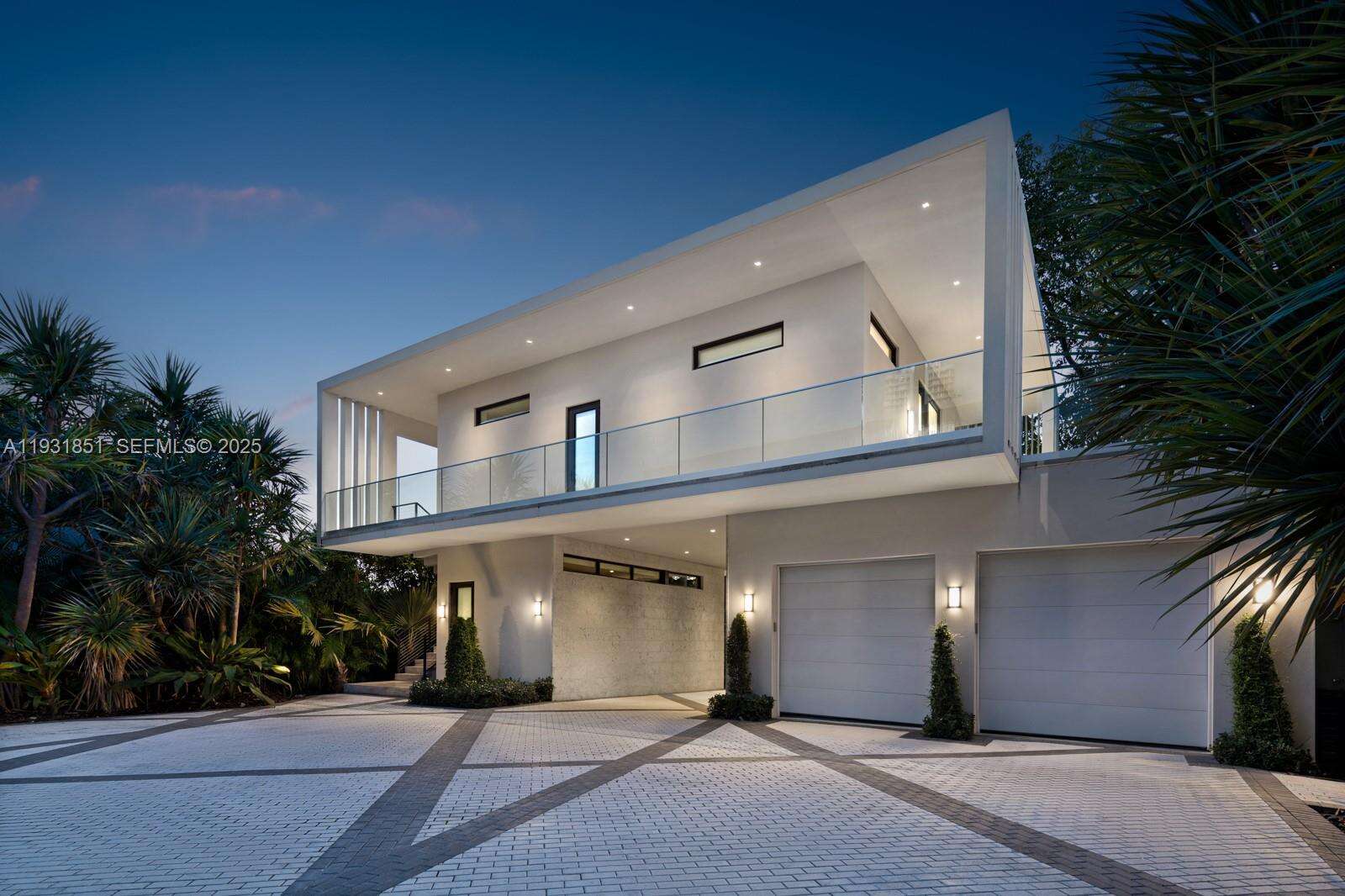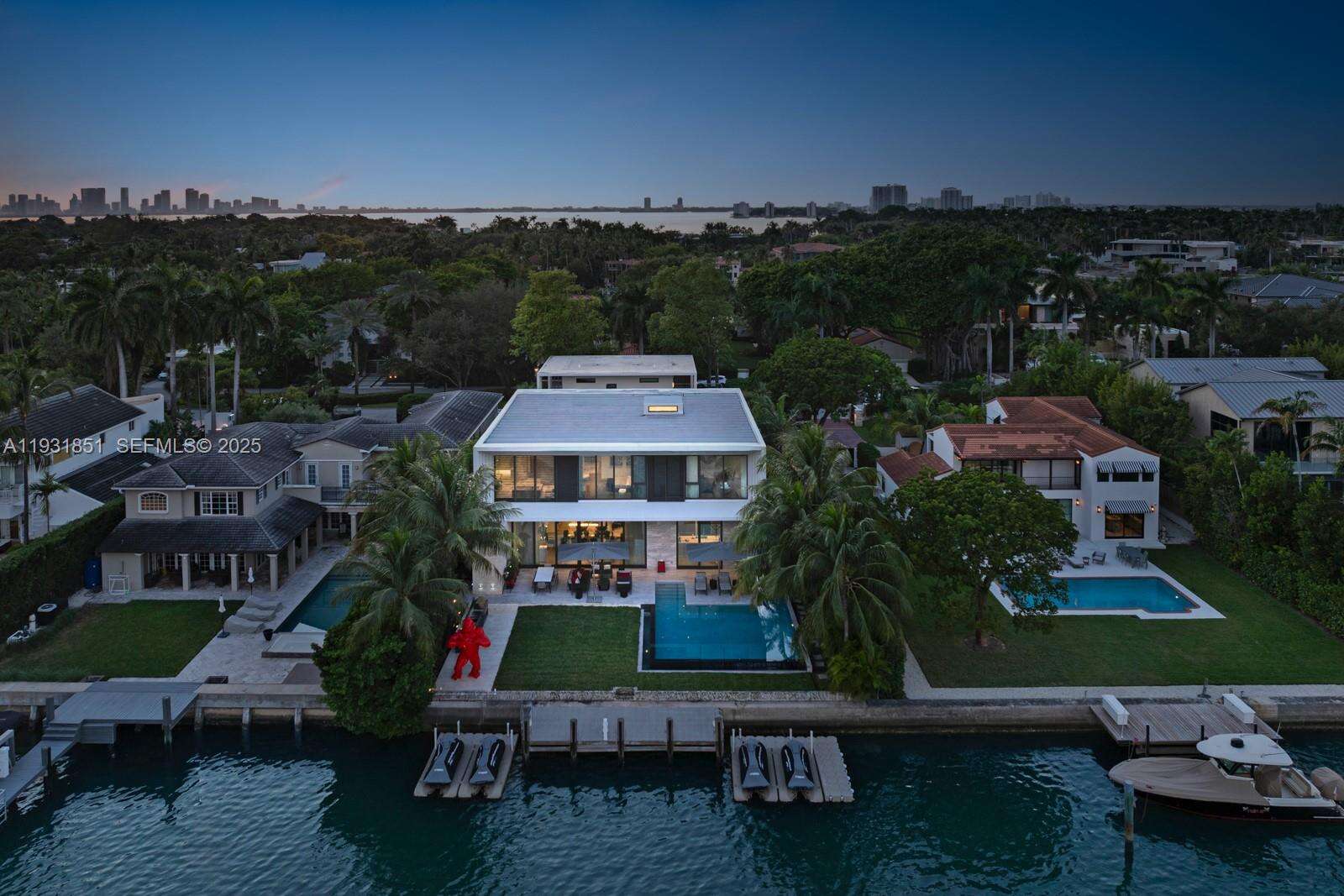 Private island living at its finest. This tropical modern estate, designed by Domo Architecture, sits on a 17,280 SF waterfront lot with 80 feet of water frontage. Offering 7,910 SF of interior living space, the home features 7 bedrooms, 7 full bathrooms, and 2 half bathrooms. Highlights include a gourmet chef’s kitchen, media room, elevator, and a primary suite with private sitting room. Outdoor living is elevated with a heated pool and spa, outdoor shower, and tranquil koi pond. The property includes a separate guest house and main residence, along with a two-car garage, creating a true private island retreat.