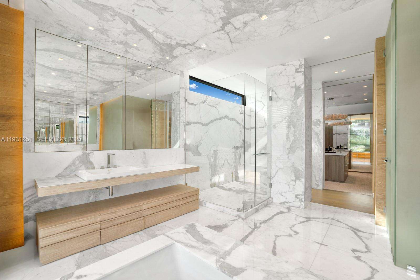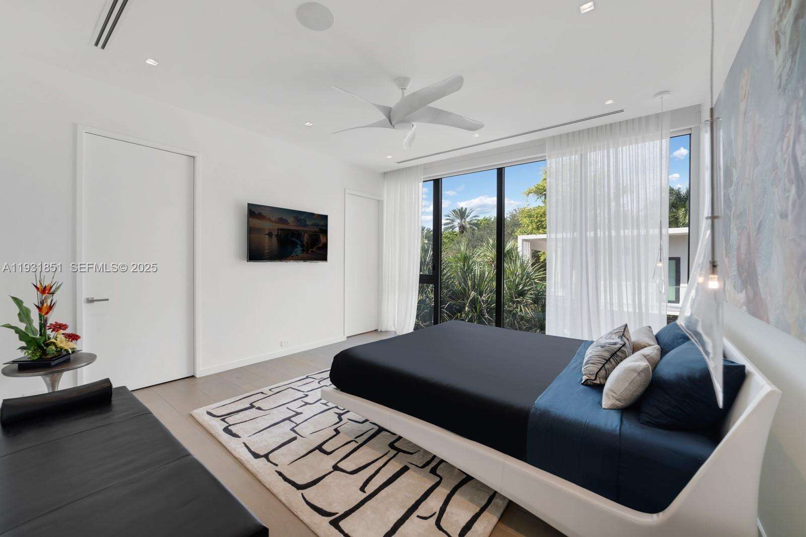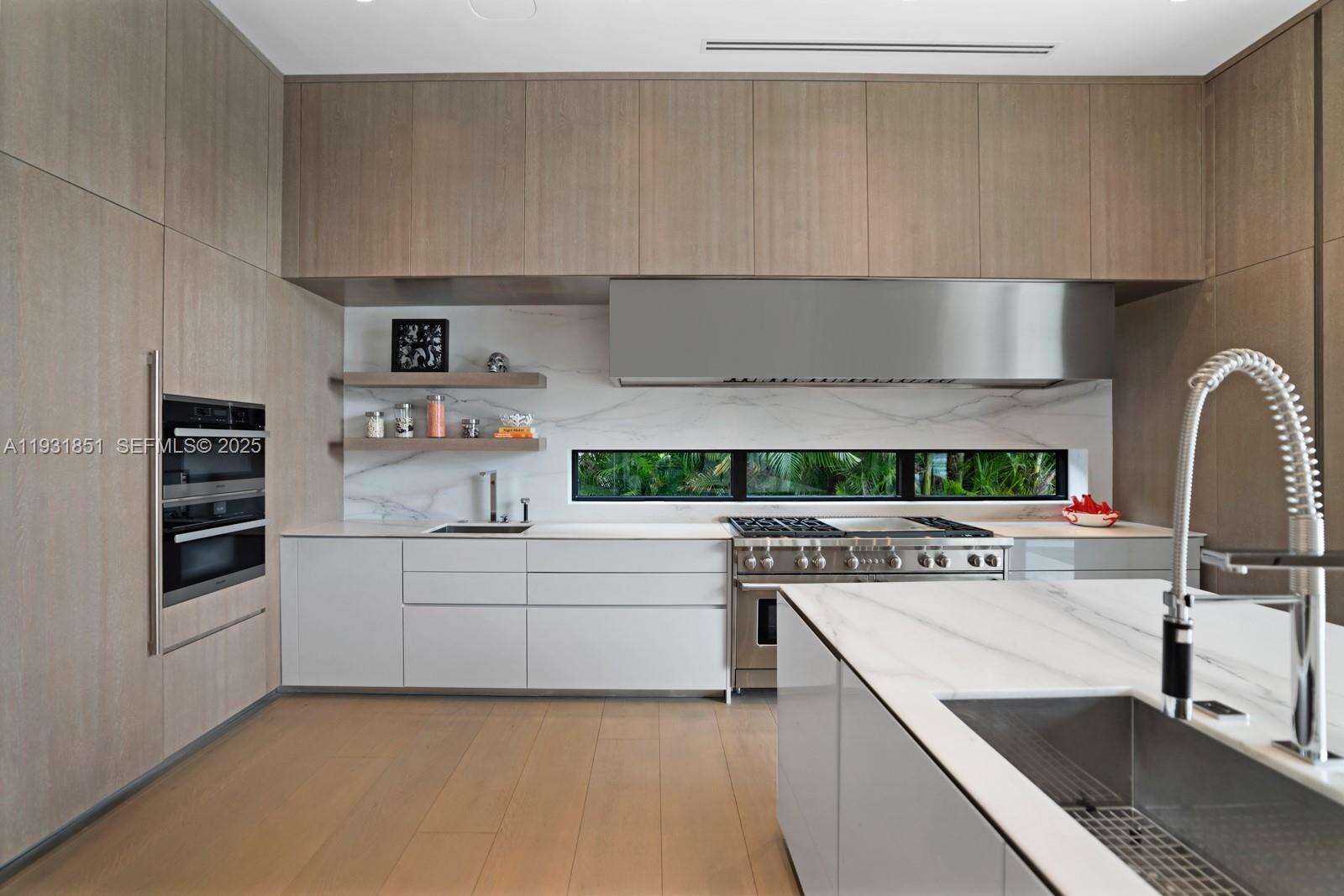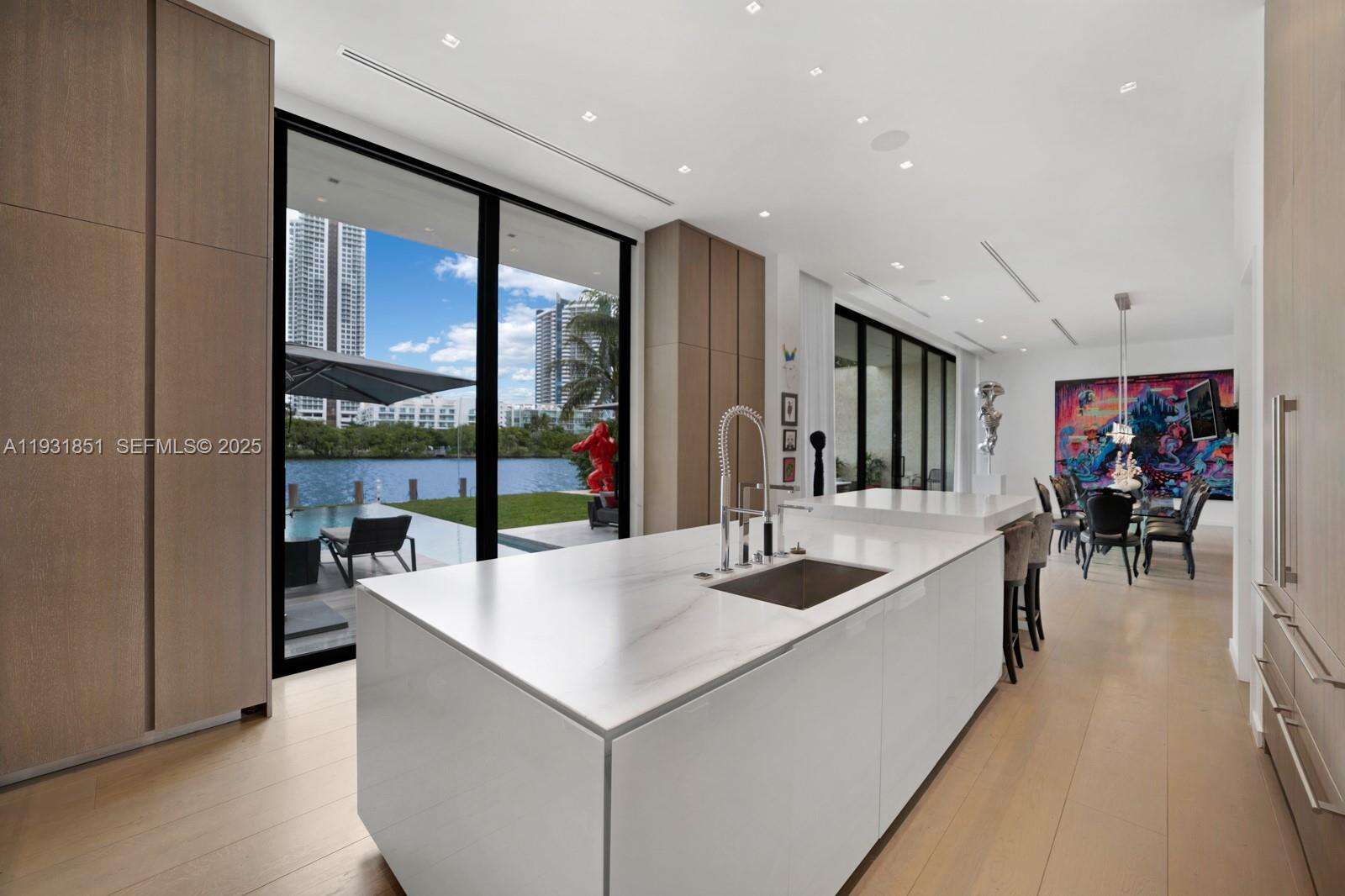 Private island living at its finest. This tropical modern estate, designed by Domo Architecture, sits on a 17,280 SF waterfront lot with 80 feet of water frontage. Offering 7,910 SF of interior living space, the home features 7 bedrooms, 7 full bathrooms, and 2 half bathrooms. Highlights include a gourmet chef’s kitchen, media room, elevator, and a primary suite with private sitting room. Outdoor living is elevated with a heated pool and spa, outdoor shower, and tranquil koi pond. The property includes a separate guest house and main residence, along with a two-car garage, creating a true private island retreat.