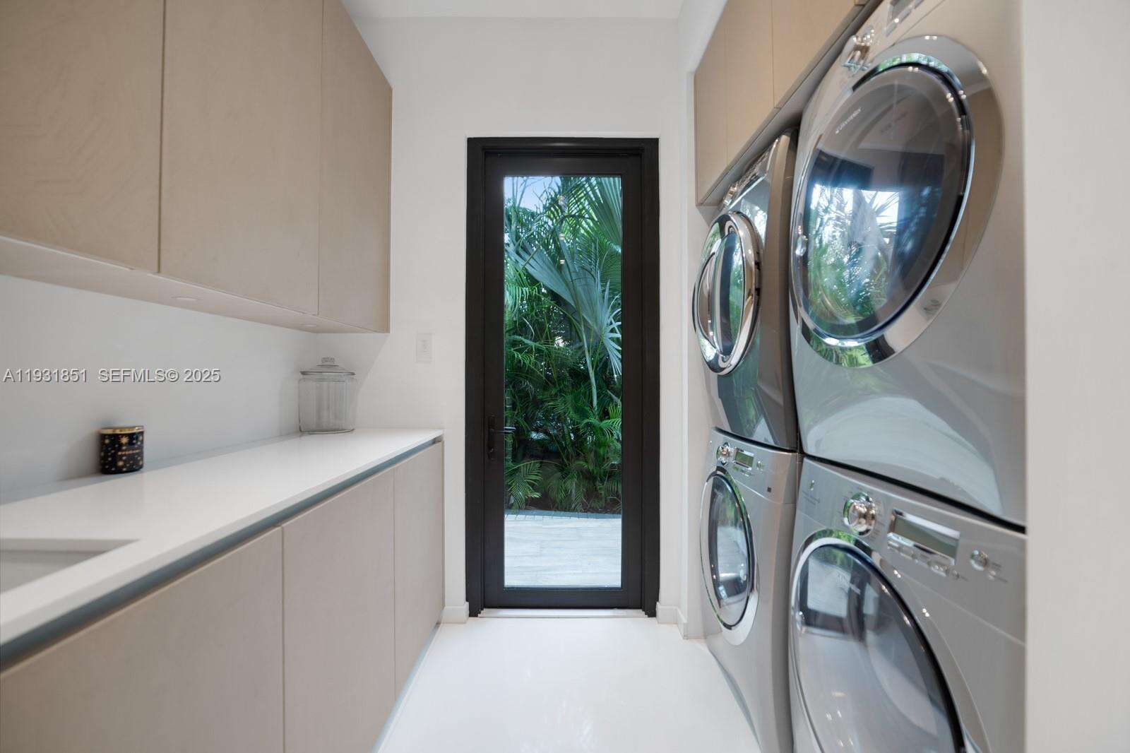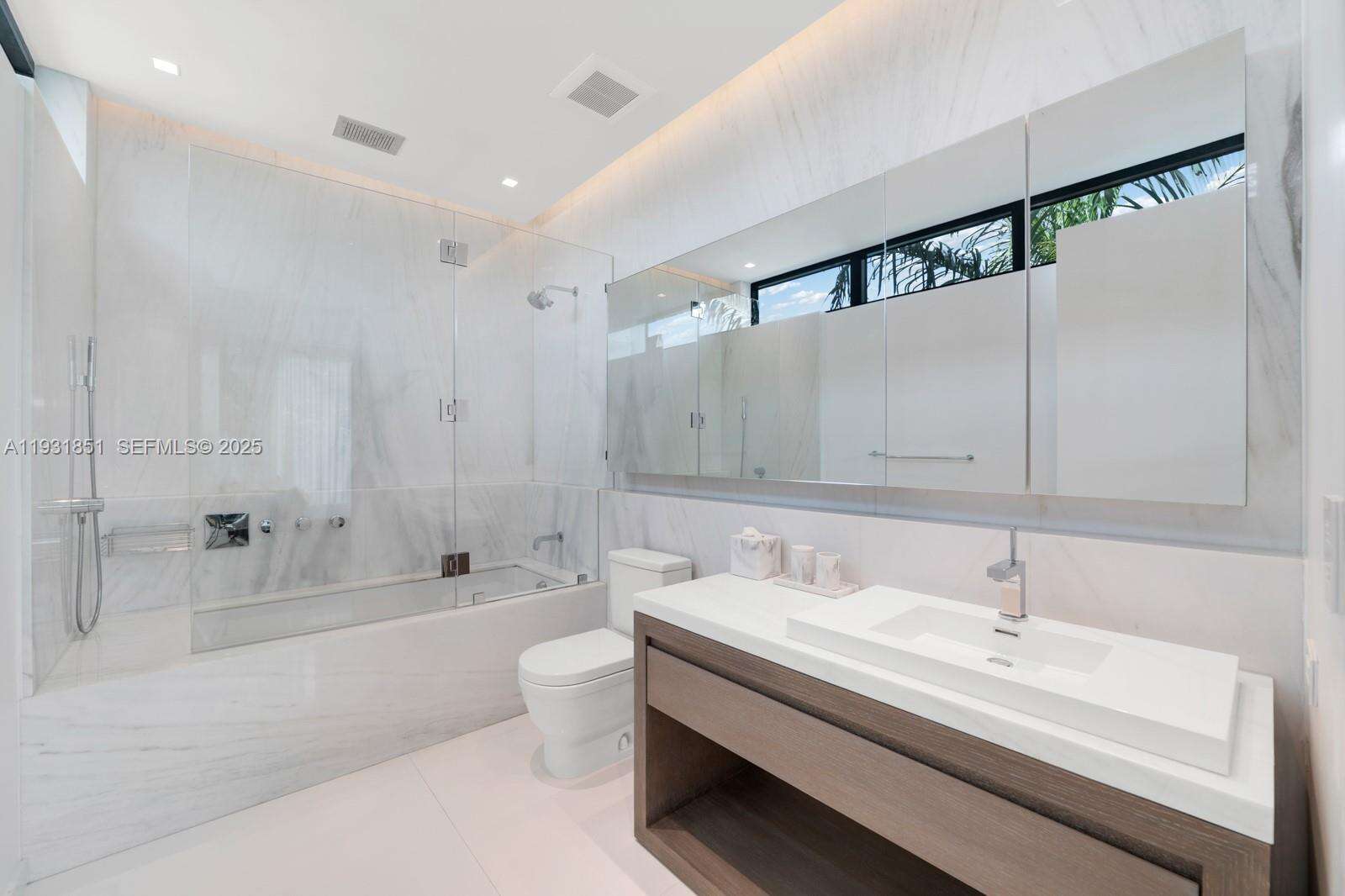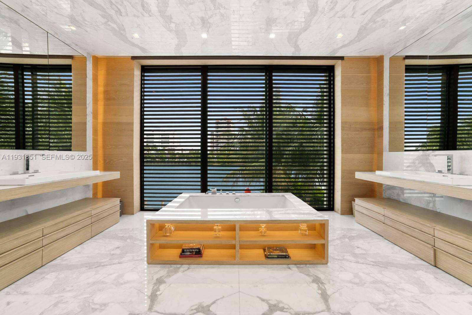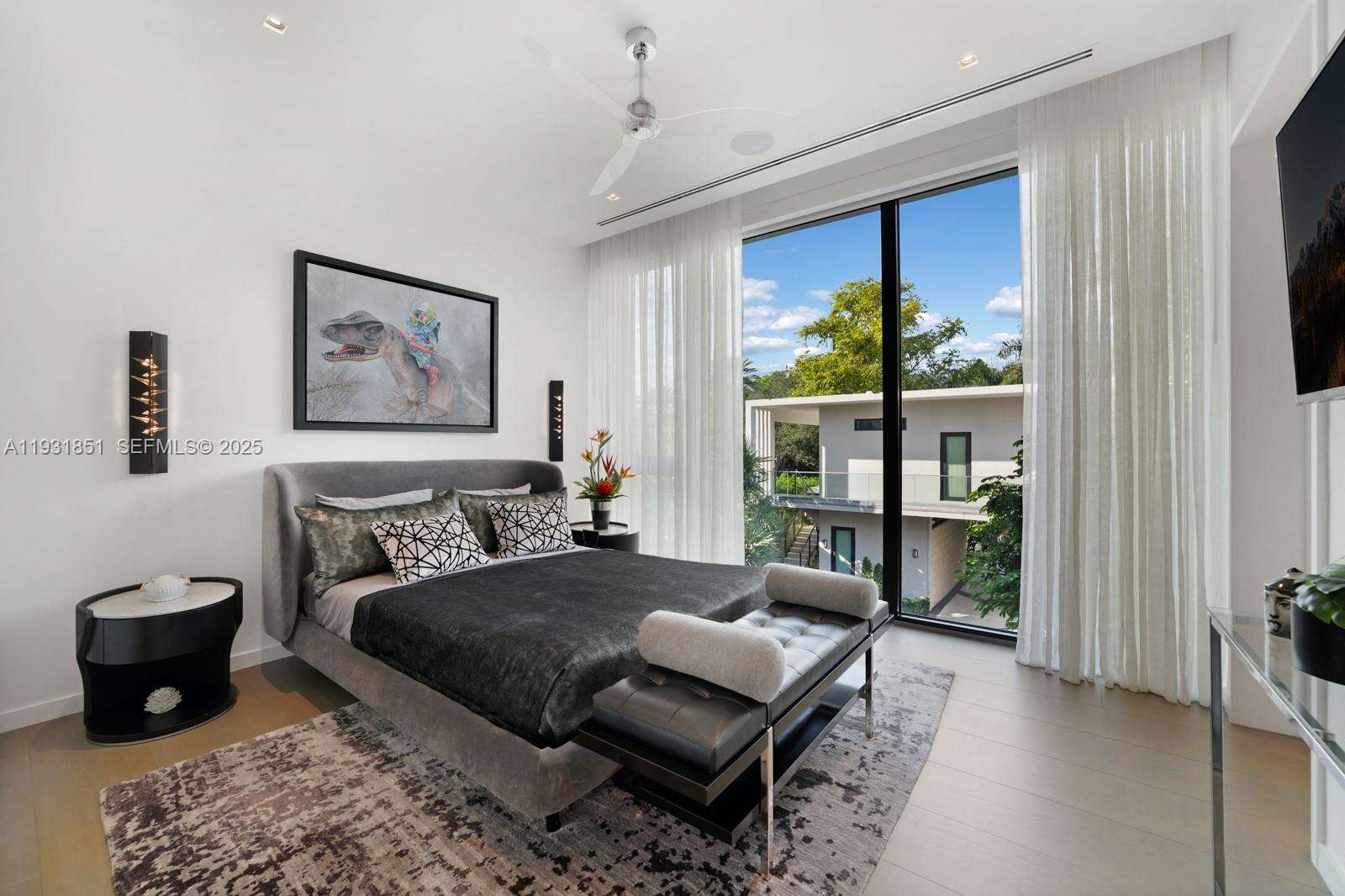 Private island living at its finest. This tropical modern estate, designed by Domo Architecture, sits on a 17,280 SF waterfront lot with 80 feet of water frontage. Offering 7,910 SF of interior living space, the home features 7 bedrooms, 7 full bathrooms, and 2 half bathrooms. Highlights include a gourmet chef’s kitchen, media room, elevator, and a primary suite with private sitting room. Outdoor living is elevated with a heated pool and spa, outdoor shower, and tranquil koi pond. The property includes a separate guest house and main residence, along with a two-car garage, creating a true private island retreat.