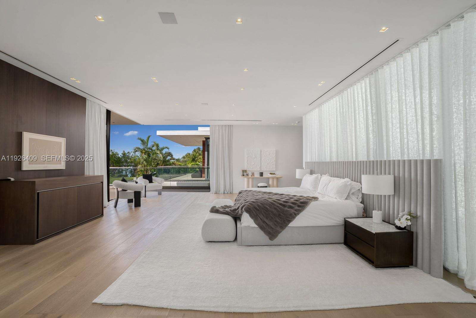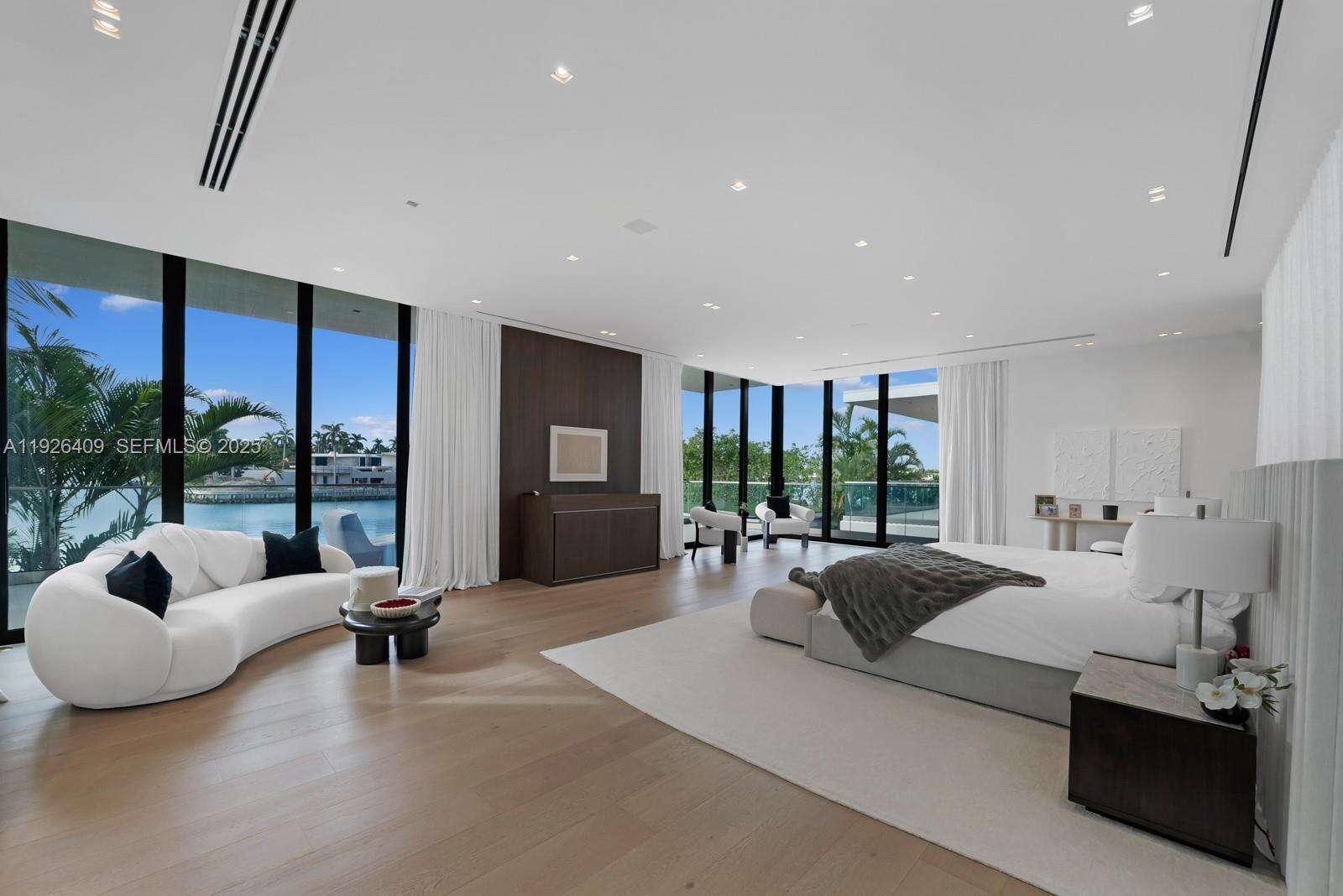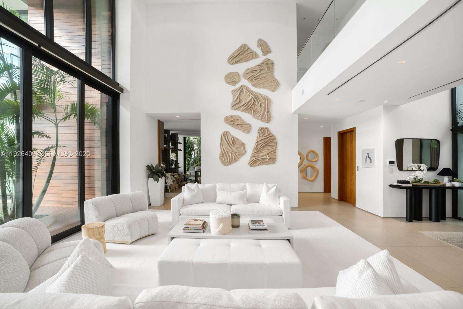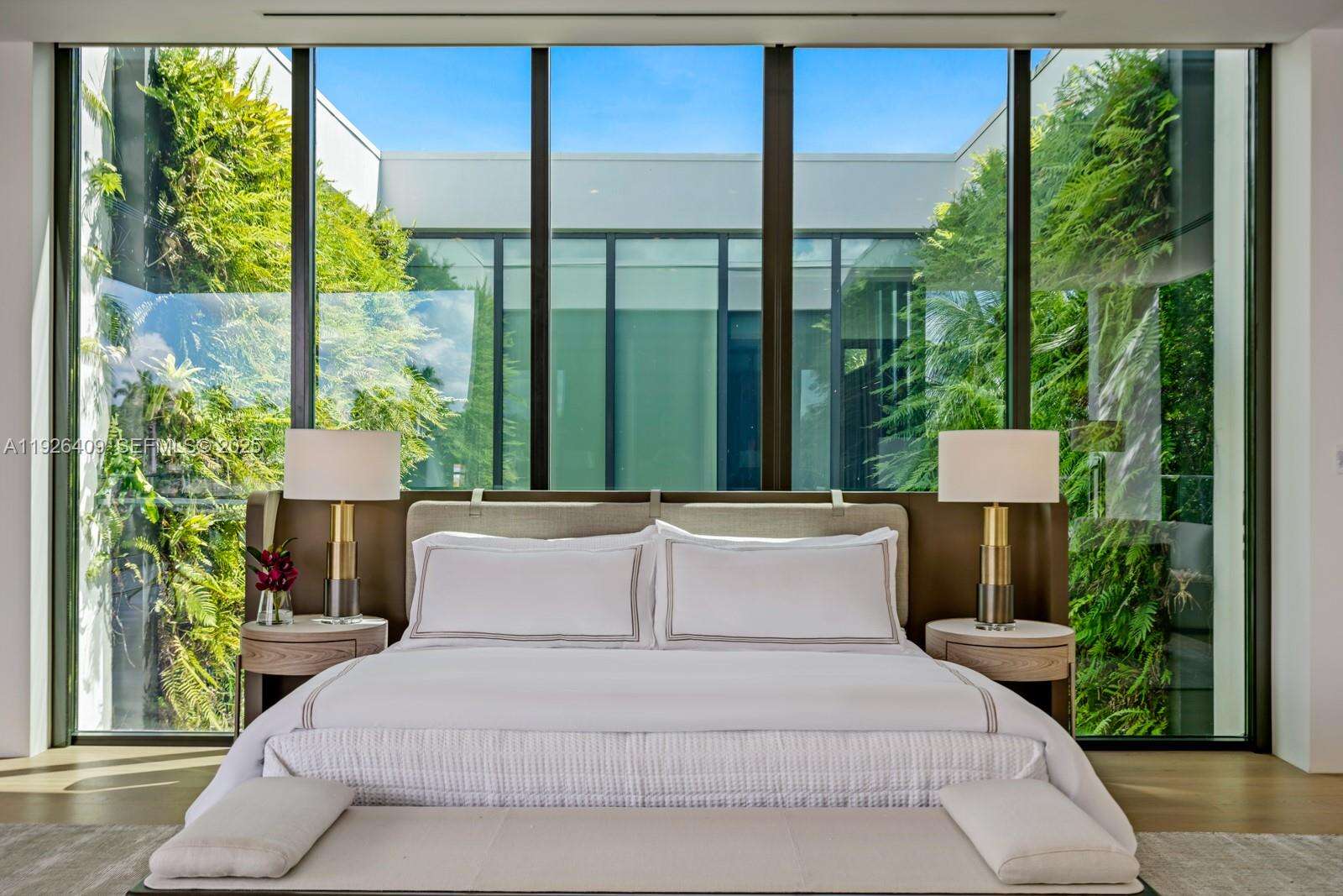 Tropical modern masterpiece on exclusive Allison Island, designed by acclaimed architecture & design firm Choeff Levy Fischman. The impressive residence spans 10,632 SF of interior space featuring 7 bedrooms, 9 full baths, and 2 half baths, a media room, wine cellar, and multiple living areas ideal for entertaining. The expansive primary suite includes dual spa-inspired baths, walk-in closets, a sitting area, floor-to-ceiling windows, and a private terrace offering stunning sunset views. Additional features include dramatic 22-foot ceilings, two family rooms, and a junior suite with a private terrace. The chef’s kitchen showcases custom Italian cabinetry with Sub-Zero and Wolf appliances, along with a separate staff/service kitchen and quarters. Situated on a 23,760 SF lot with 110 feet of water frontage, the home enjoys direct waterfront access and exceptional privacy. Allison Island offers one of Miami Beach’s most exclusive guard-gated communities, providing 24-hour security within an intimate luxury enclave.