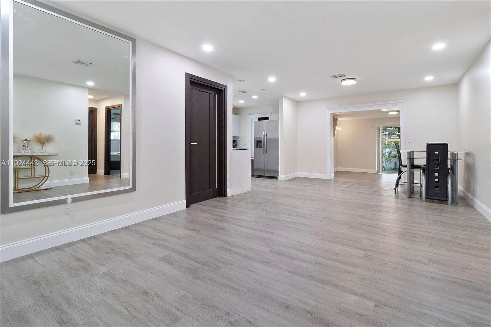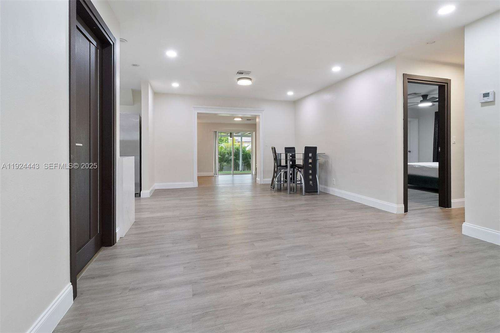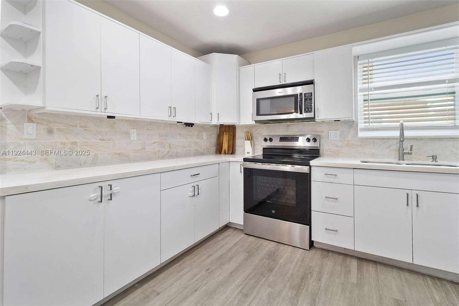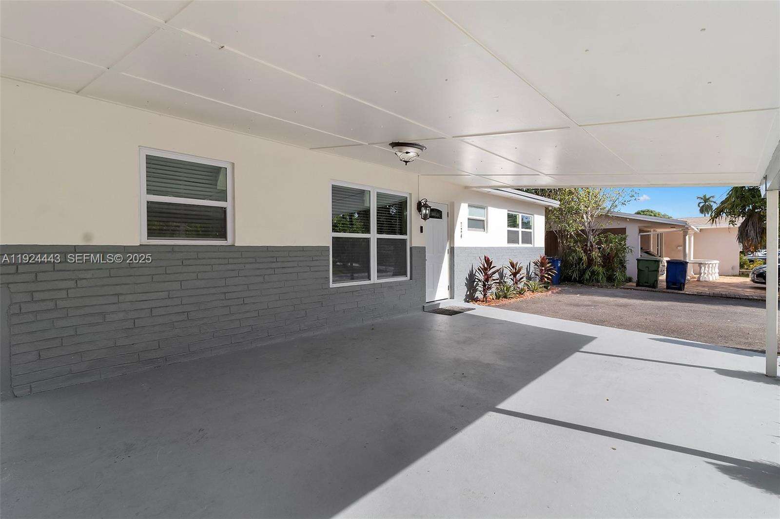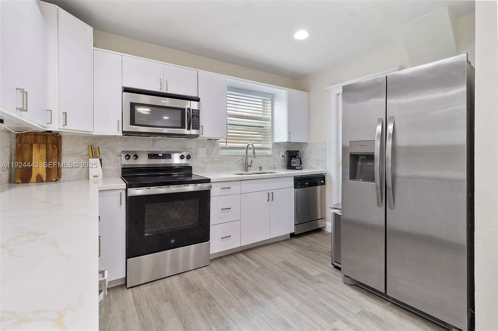 Stunning modern renovation of single-family home in a booming area of Hallandale Beach. Property includes 3 bedrooms and 2 bathrooms. Master bedroom has a walk-in closet with large attached bathroom with double vanity sink. Renovations include new roof, new hurricane windows/doors, new waterproof flooring, quartz countertops in kitchen, appliances, washer/dryer, updated bathrooms and kitchen, lighting improvements, and paved driveway. Property has open layout with designated dining area, living room, and entertainment room. Covered patio and shed in backyard along with a new PVC fence. Landscaping improvements give the property great curb appeal. This property won't last long, so come and take a look!
