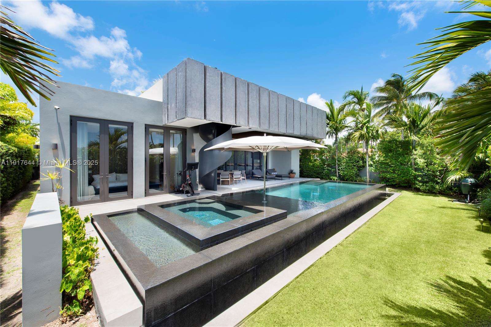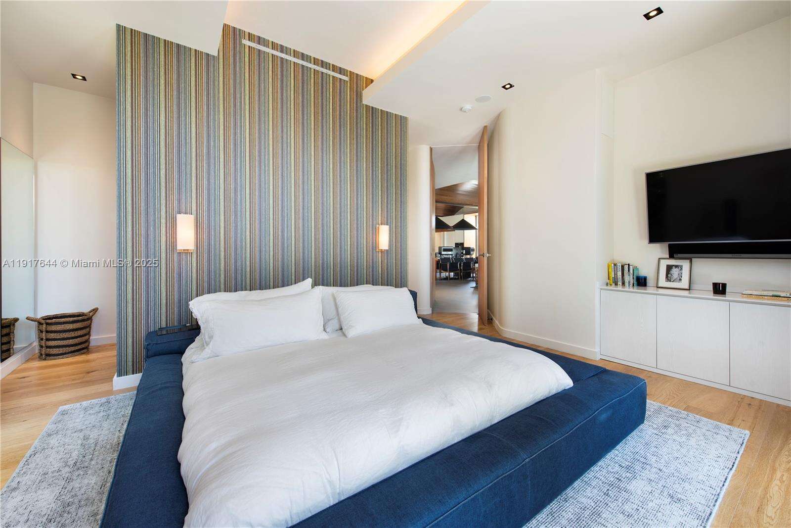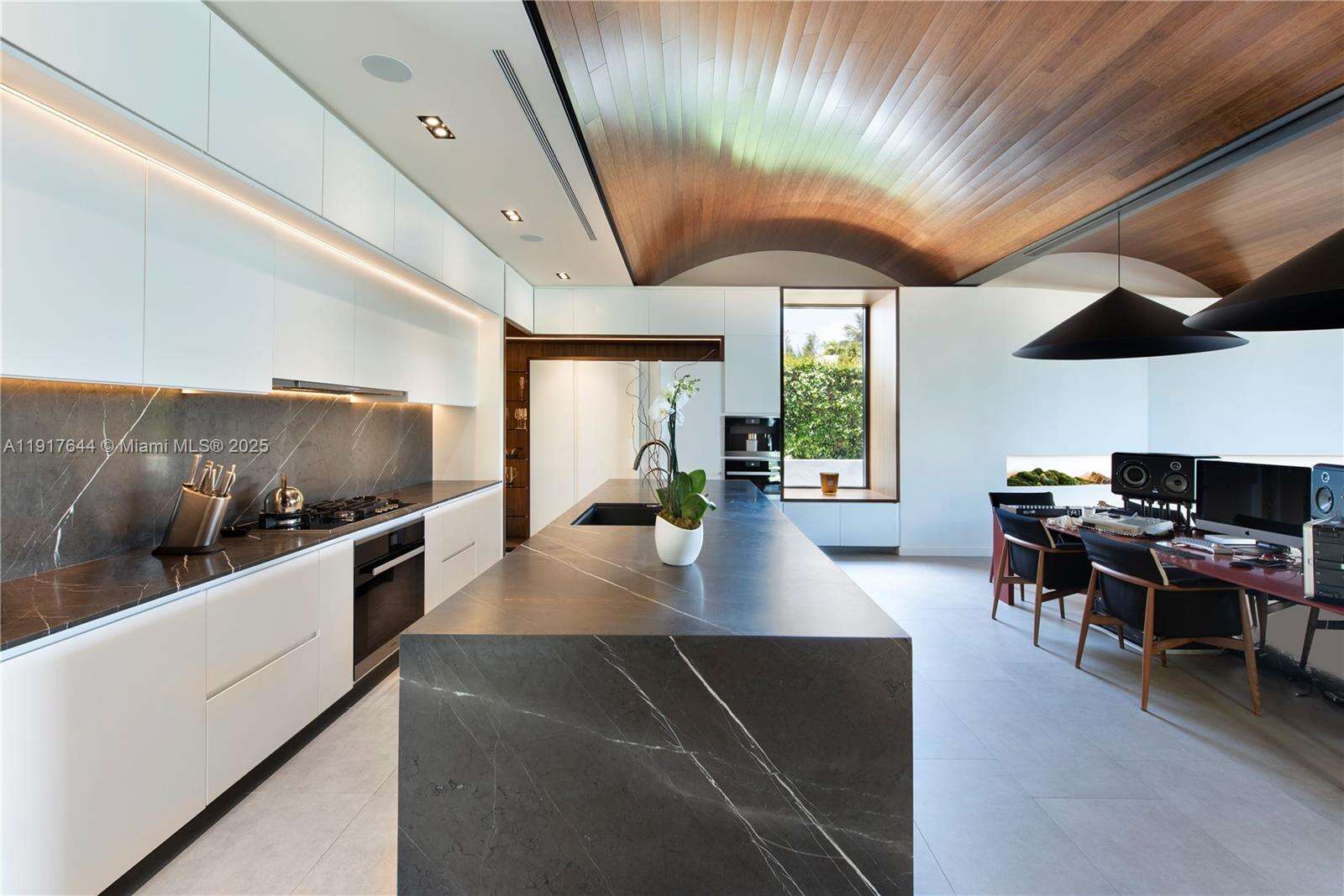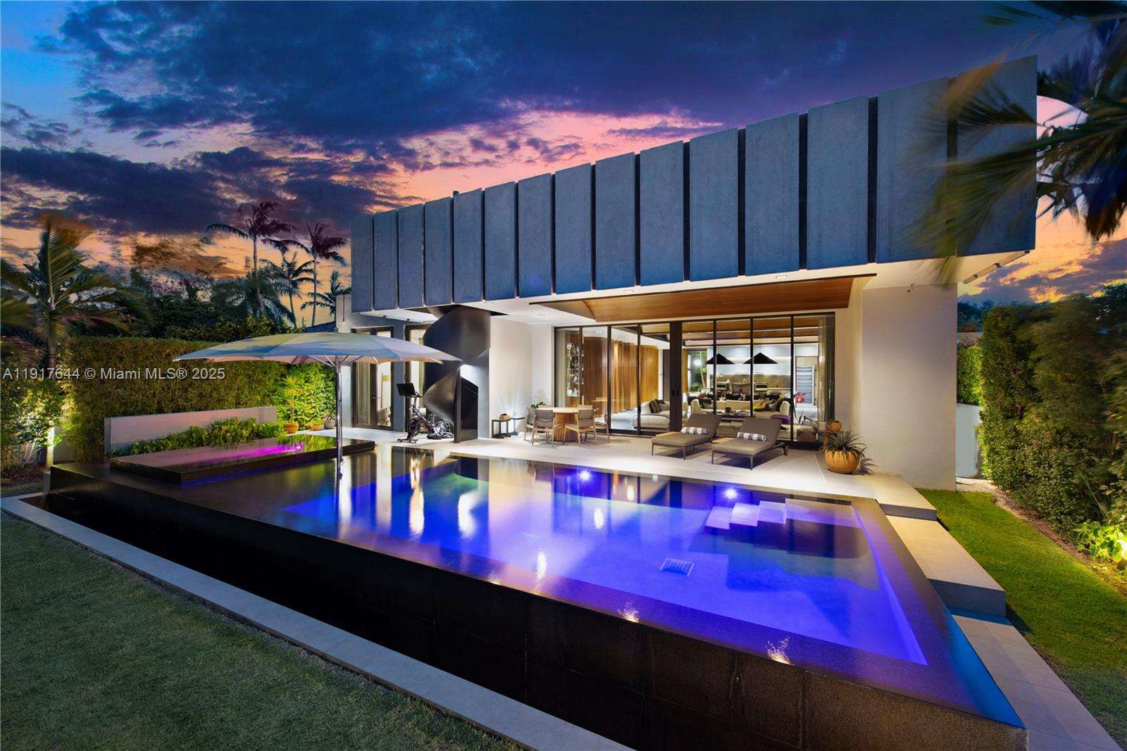 Modern waterfront home combining international craftsmanship, advanced technology, and serene design. Built with impact-resistant glass and Fleetwood sliding doors, the residence features app-controlled Lutron lighting, hidden blackout shades in all bedrooms, and Italian kitchen cabinetry with concealed Sub-Zero and Miele appliances. Built-in Italian closets, Italian interior doors, and Brazilian wood walls with vaulted ceilings and a hidden bar elevate the interior. Outdoor spaces include a finished rooftop patio with Renu cold plunge, app-controlled heated pool and adjacent spa, and a private dock with boat lift for up to a 38-foot vessel. Wellness upgrades include a whole-home alkaline water system and germicidal UV A/C purification. The grounds feature designer landscaping with a dramatic living wall entryway and a sculpture garden showcasing an original Mattis Bitzer installation acquired at Art Basel and exhibited at the Louvre. This property offers understated luxury with exceptional attention to detail inside and out.