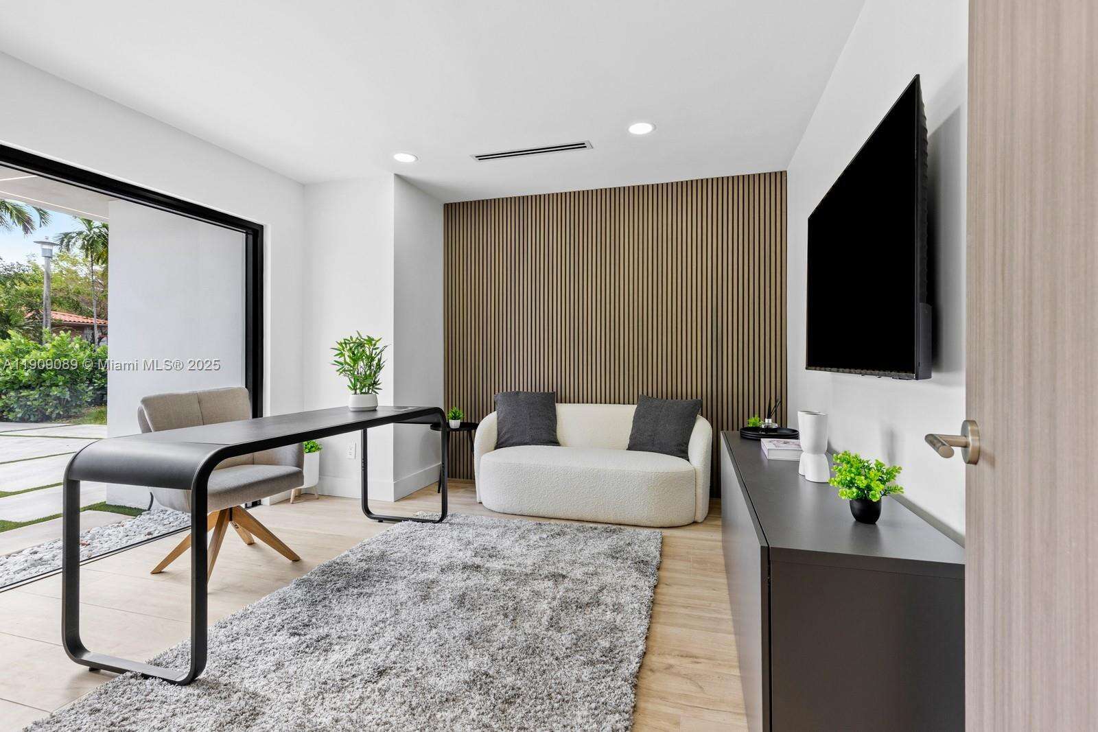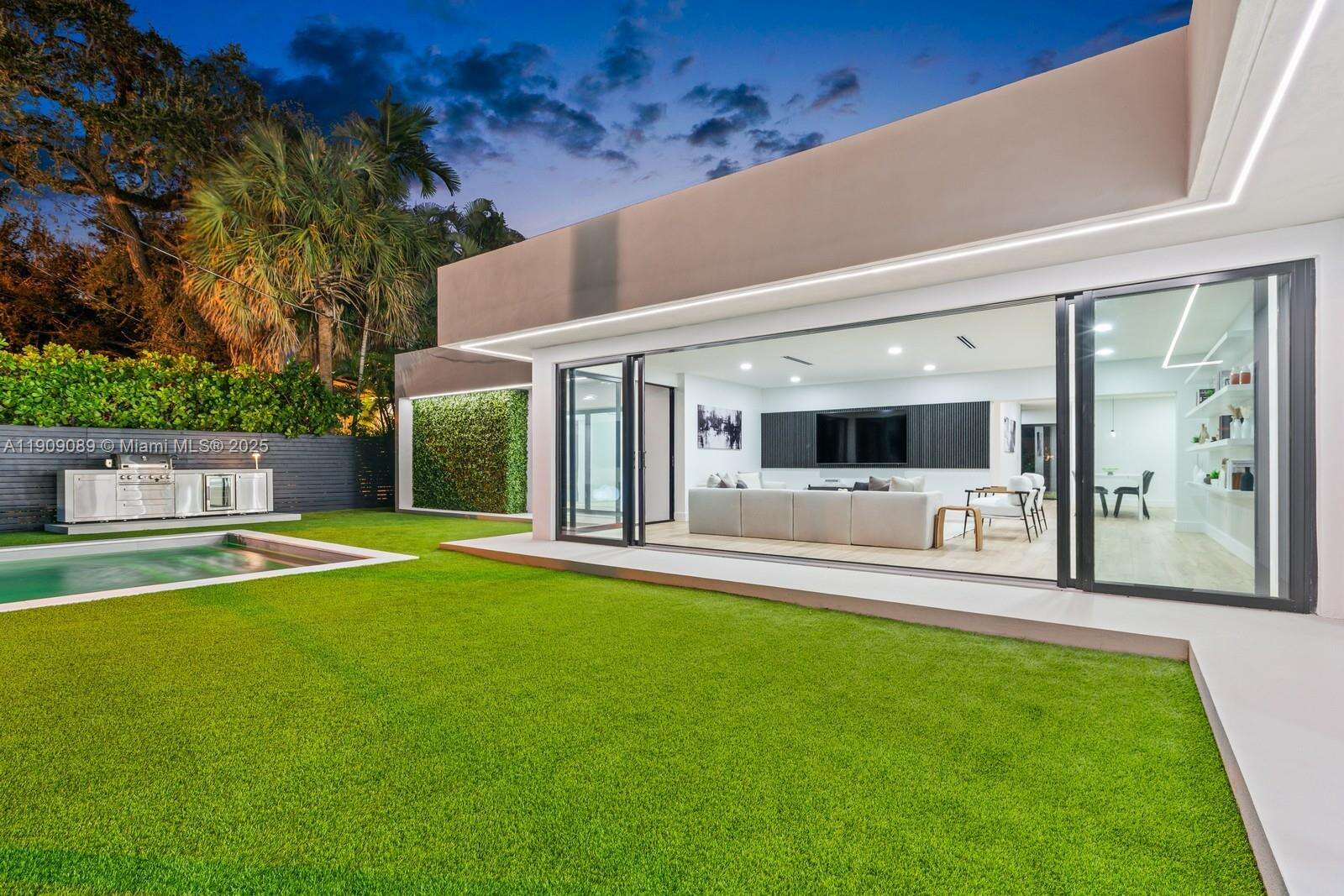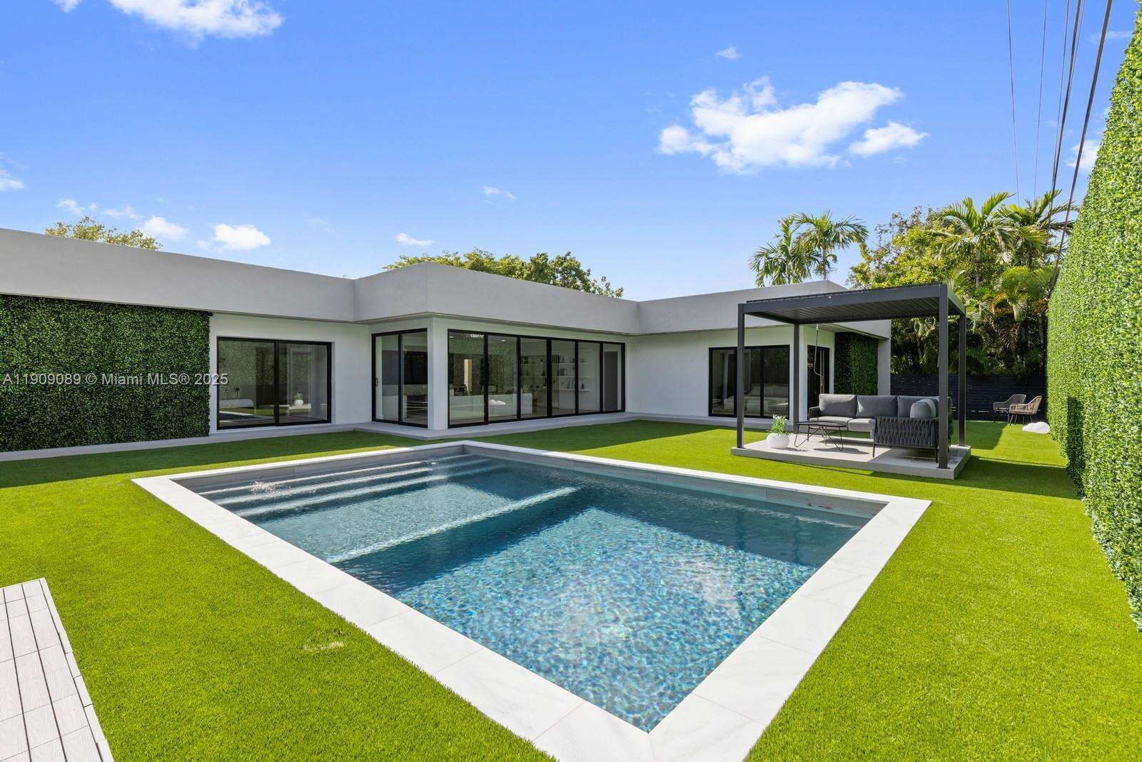 Experience Luxury living in this architectural masterpiece located in the highly coveted neighborhood of Bay Heights in Coconut Grove. This 5bed/5bath plus office has undergone a complete renovation, combining modern elegance with timeless design. Set on 11,500 sqft. lot, this home is filled with natural light and features an open-concept floor plan connecting living, dining, and outdoor spaces. The living room boasts sliding glass doors that open on all sides, epitomizing for an indoor-outdoor lifestyle. Architectural highlights include sleek LED strip lighting, lush boxwood details, and warm slatted wood accents. The private backyard is surrounded by mature landscaping, a pool, BBQ area, and pergola. Nestled in the 24/7 police-patrolled community of Bay Heights. Offered Fully Furnished.