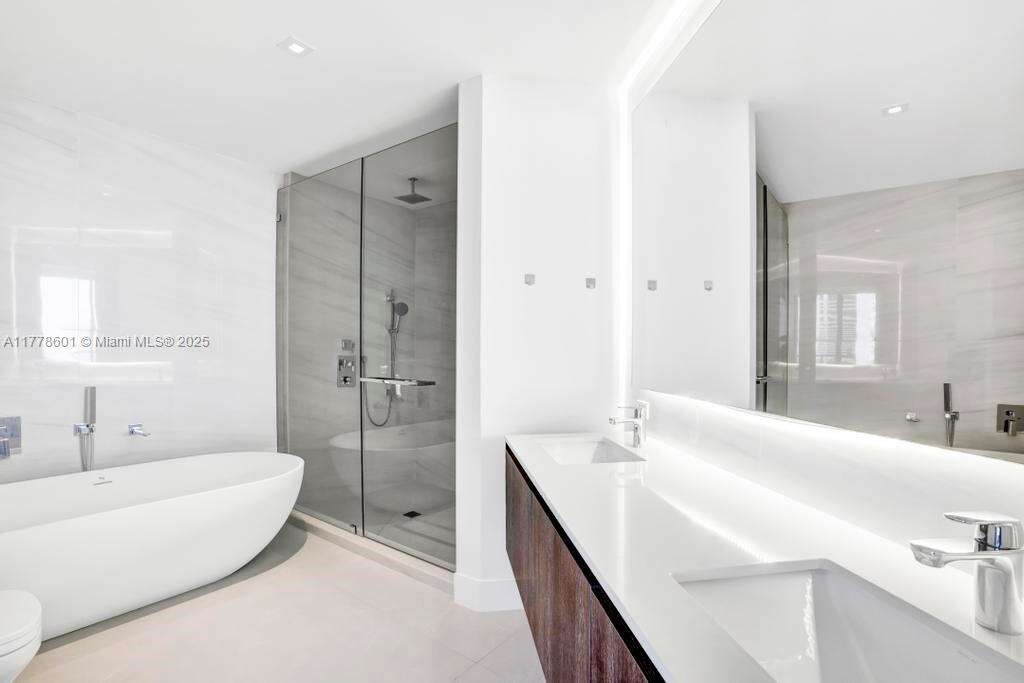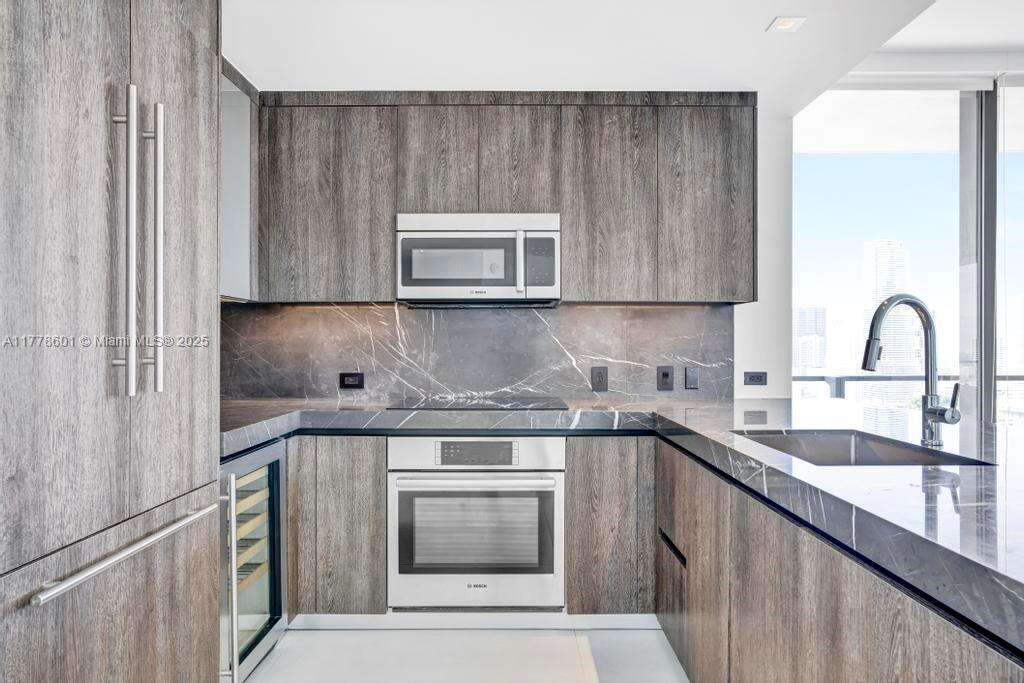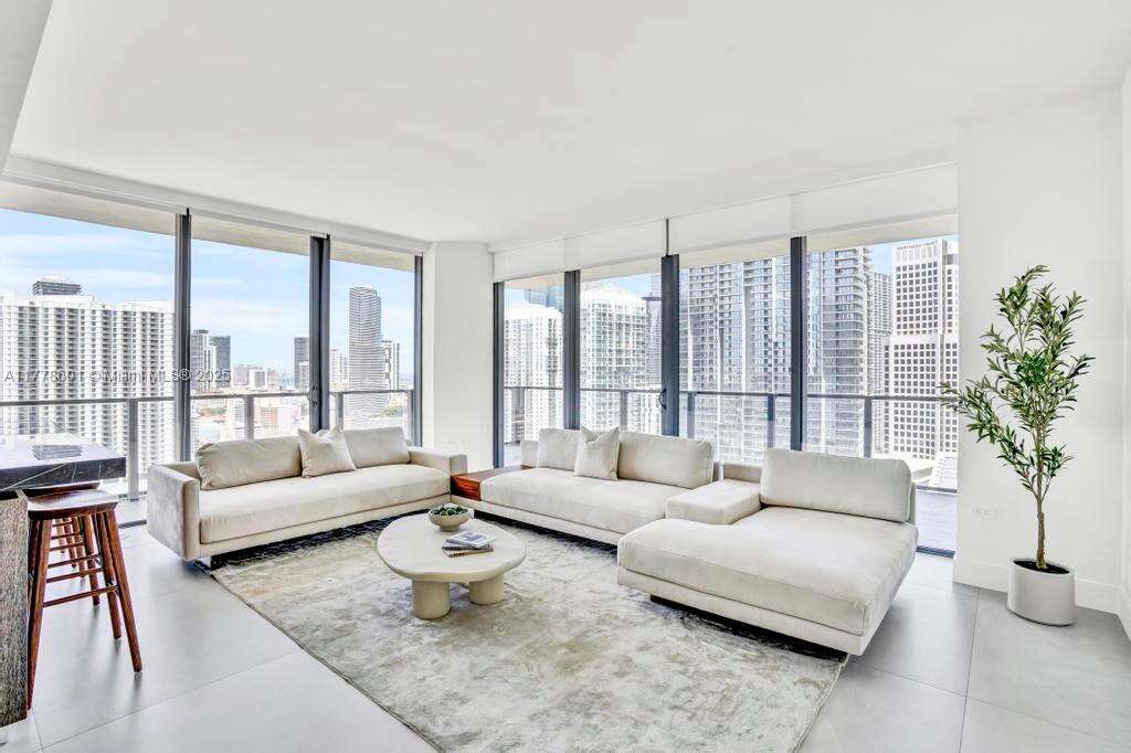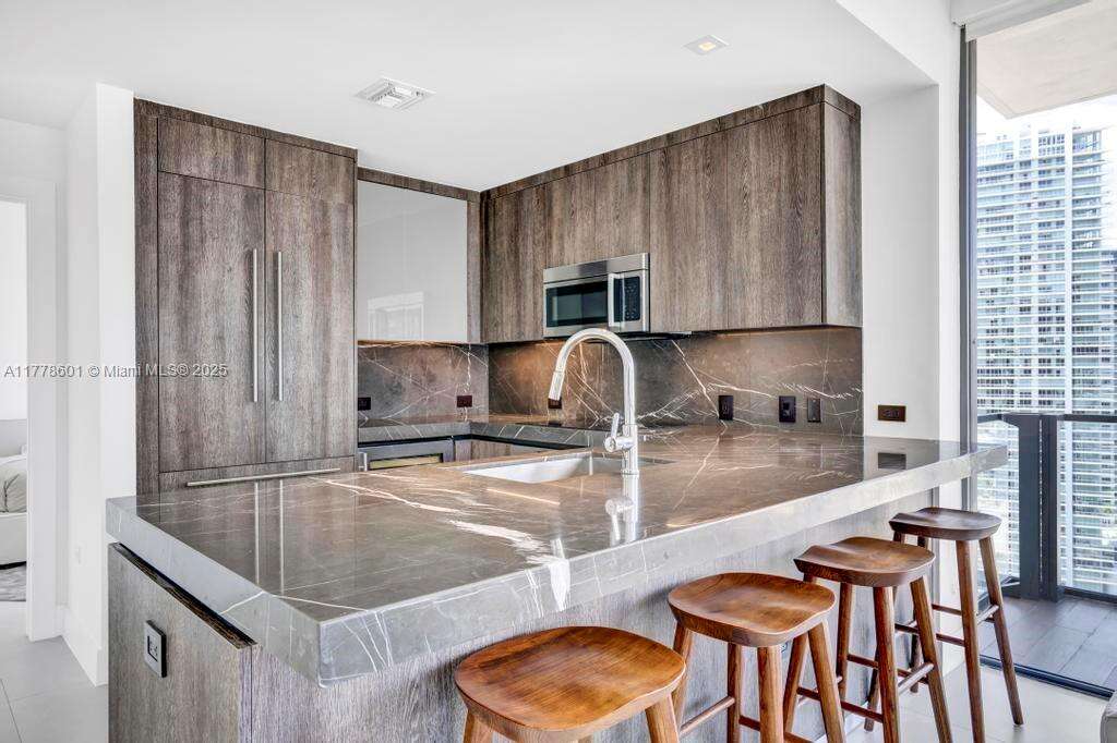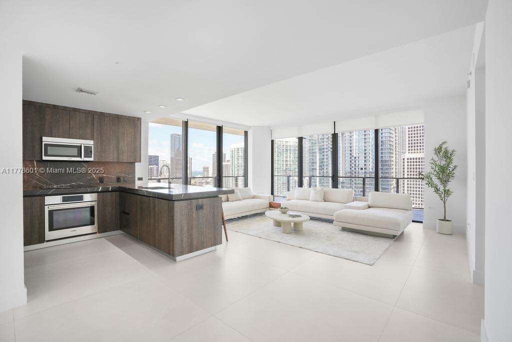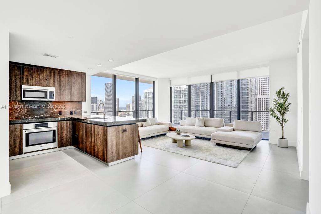 Indulge in this exquisitely reimagined 2/2.5 residence at The Rise Brickell City Centre that offers sweeping sunrise views over Biscayne Bay & the Miami skyline with floor-to-ceiling windows & a generous wraparound balcony. Every detail has been curated to perfection—from the grand 48x48 Gubi porcelain tile flooring to the sleek, modern kitchen with bespoke Italian cabinetry, honed marble countertops, Bosch appliances. The spa-inspired primary bathroom is a masterpiece in design, featuring a freestanding soaking tub & luxurious 120x120 Eco Ceramics wall tiles. Immerse yourself in a lifestyle of indulgence with exclusive access to 5-star amenities: a fitness center, heated pool, valet, Hammam spa, steam room, & more—just steps from the world-class shopping & dining of Brickell City Centre.