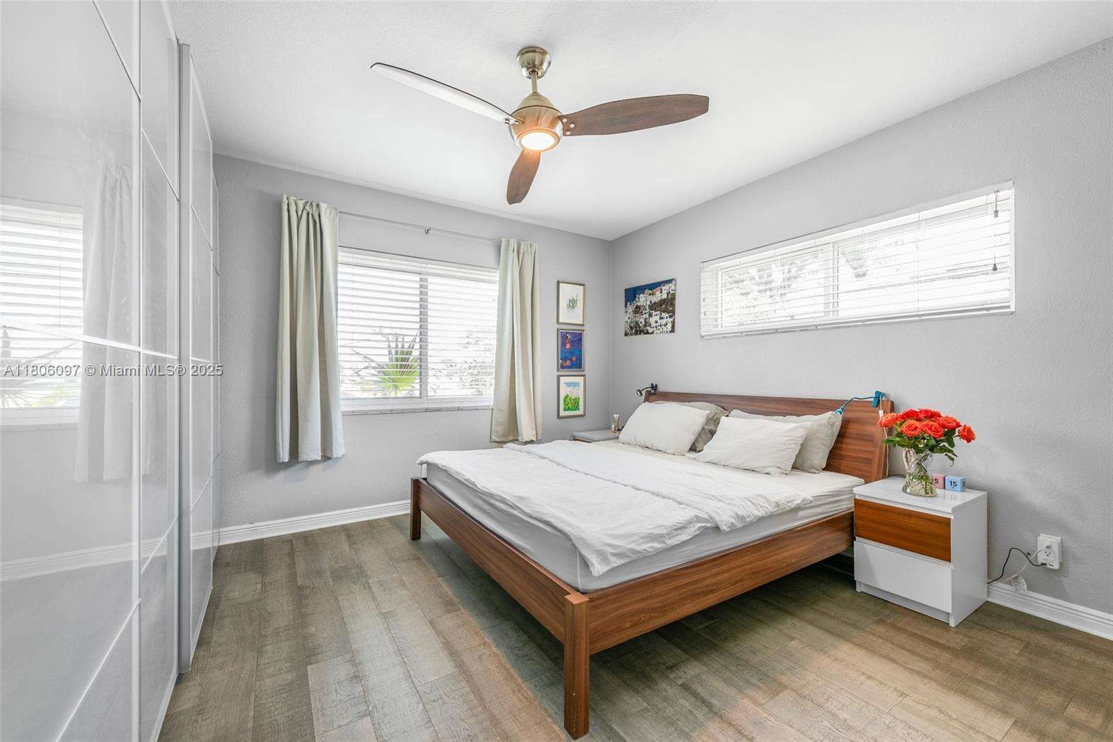 Enchanting & inviting midcentury modern home in quiet & desirable Surfside. This move-in-ready home has an ideal floor plan: charming entryway & front porch leads to an ample living room that flows into a dining room followed by a family room with breakfast nook, which leads out to an expansive wooden deck with retractable awning. The home features incredible natural light, energy-efficient impact windows & doors throughout, large patio with room for a pool, marble floors in living areas + wood floors in bdrms, split floor plan w/ 2 guest bdrms & 1 bath (w/ tub) separate from the primary bd suite w/ its own private office, 1-car garage, barrel & flat tile roof (installed 2015). Great for both quiet living & entertaining, and just blocks from the beach & many businesses, restaurants & shops