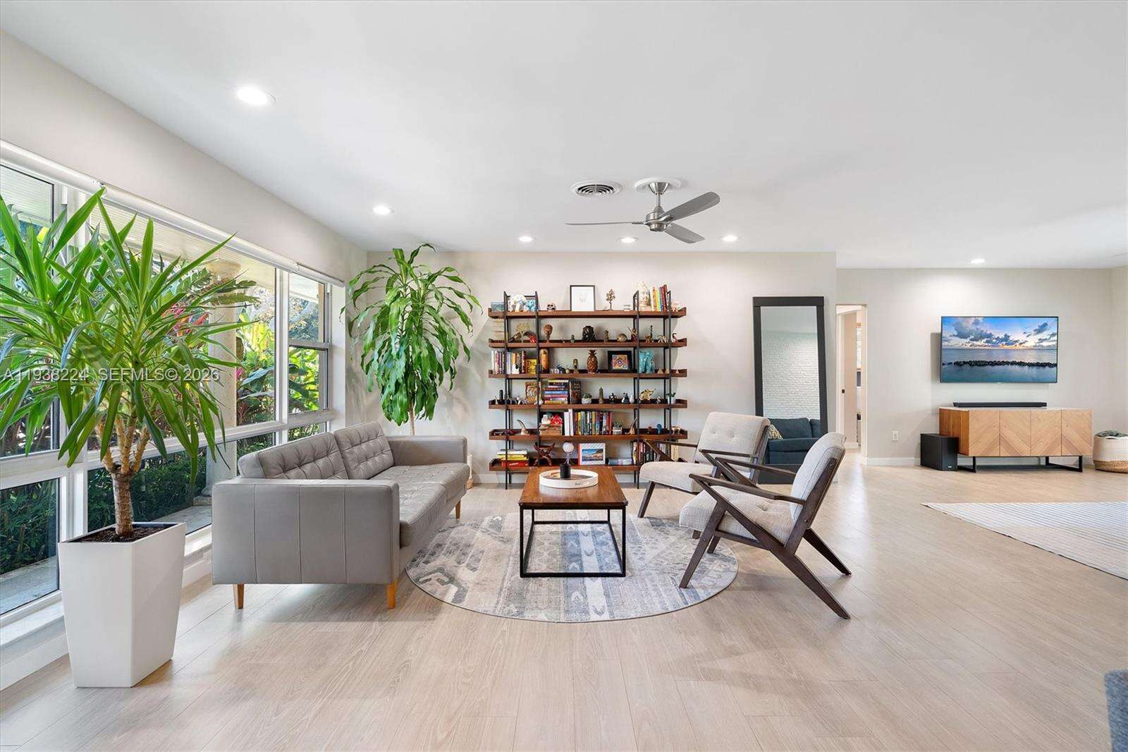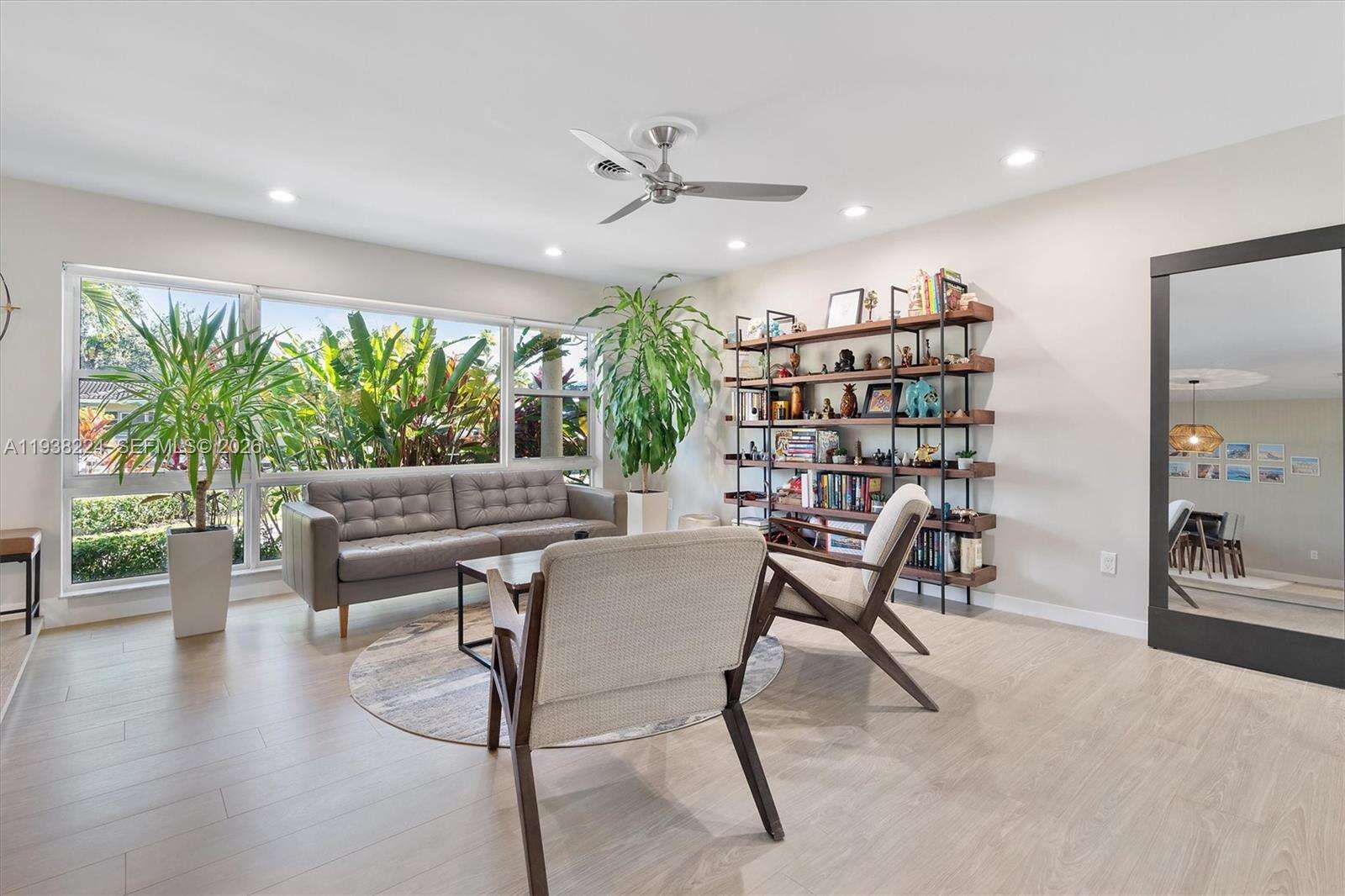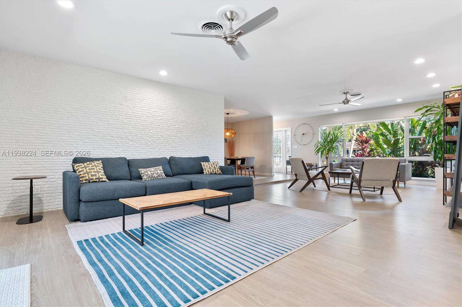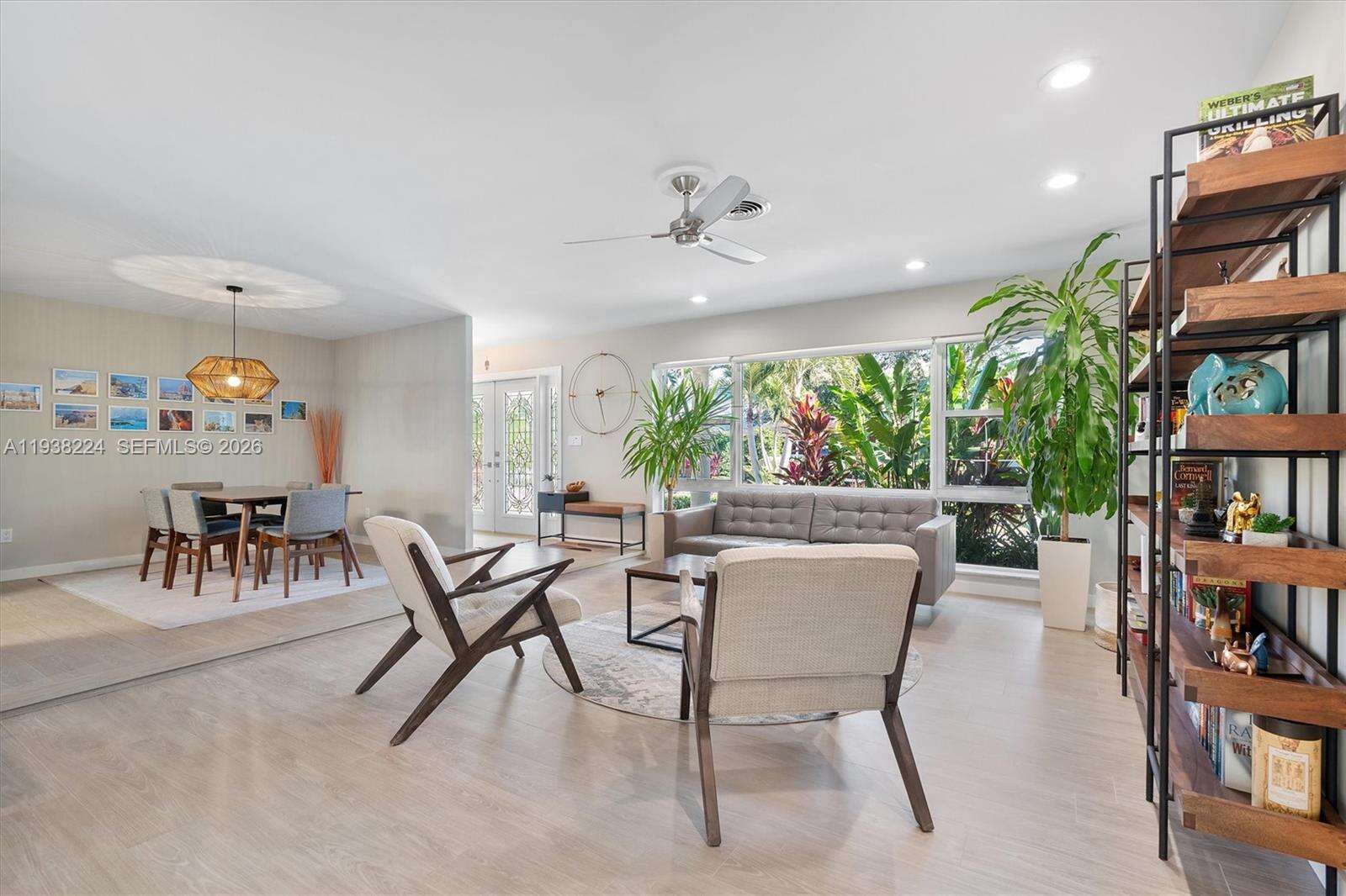 Beautifully reimagined Mid-Century Modern residence located in the highly desirable East Miami Shores neighborhood, just moments from Biscayne Bay. Set on an expansive 8,368 SF lot, this 3-bedroom, 3-bath home seamlessly blends classic architectural character with thoughtful contemporary updates. The light-filled interior features an open, flowing layout with updated flooring throughout, stylishly renovated bathrooms, and a modern kitchen equipped with premium appliances—ideal for both daily living and entertaining. Impact windows enhance comfort and peace of mind, while lush tropical landscaping surrounds the home, creating a sense of privacy and tranquility. Outdoor living shines with a screened-in pool patio designed for year-round enjoyment, offering a true resort-style atmosphere perfect for gatherings or quiet relaxation. A rear-entry two-car garage provides ample storage and presents flexible potential for a guest suite, home office, gym, or creative space. Ideally positioned near top-rated schools, Miami Shores Country Club, golf and tennis facilities, aquatic center, parks, and a variety of shopping and dining destinations—this home offers the perfect balance of luxury, lifestyle, and everyday convenience.
