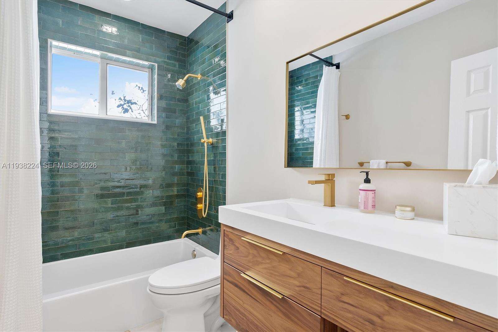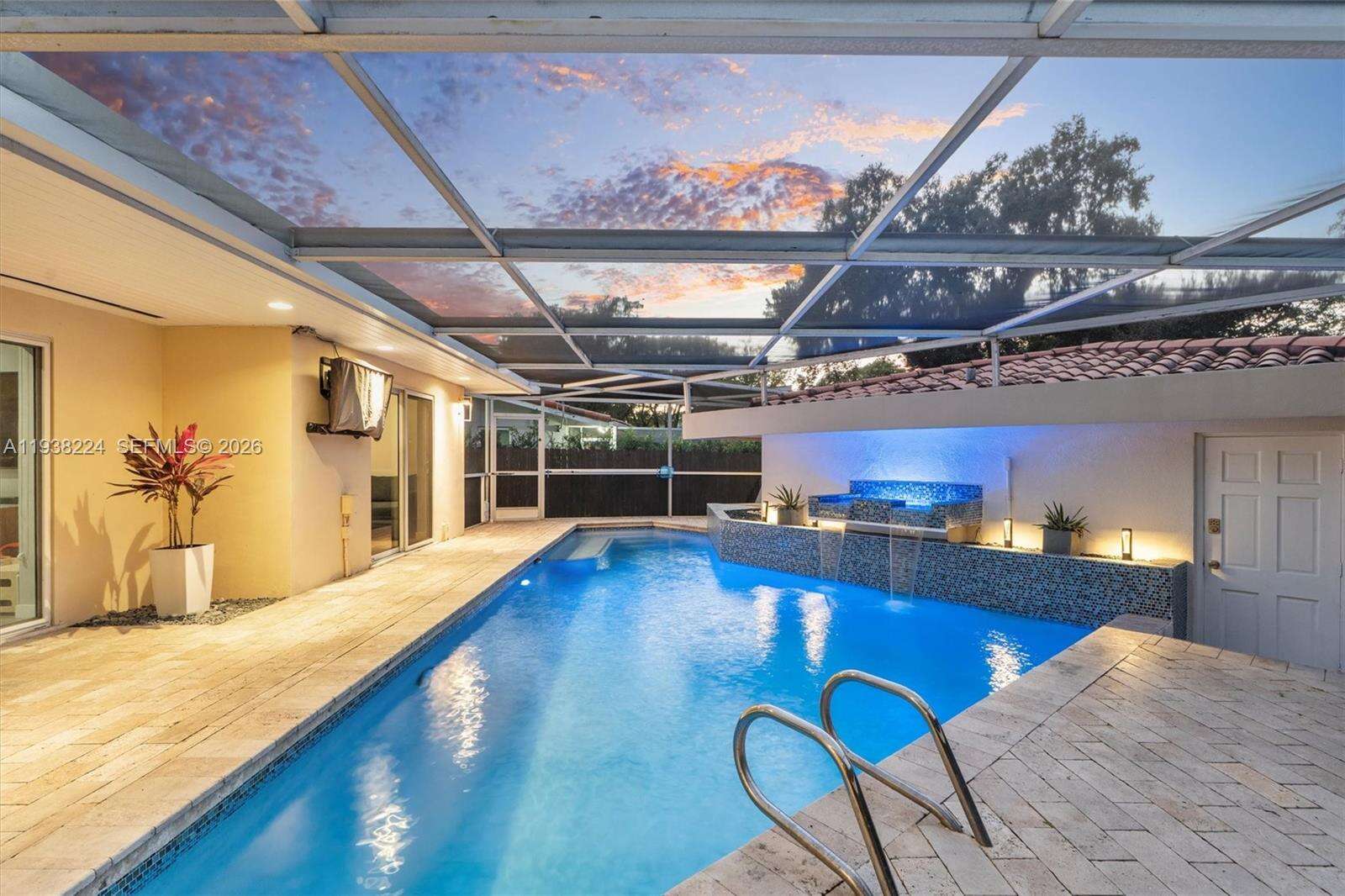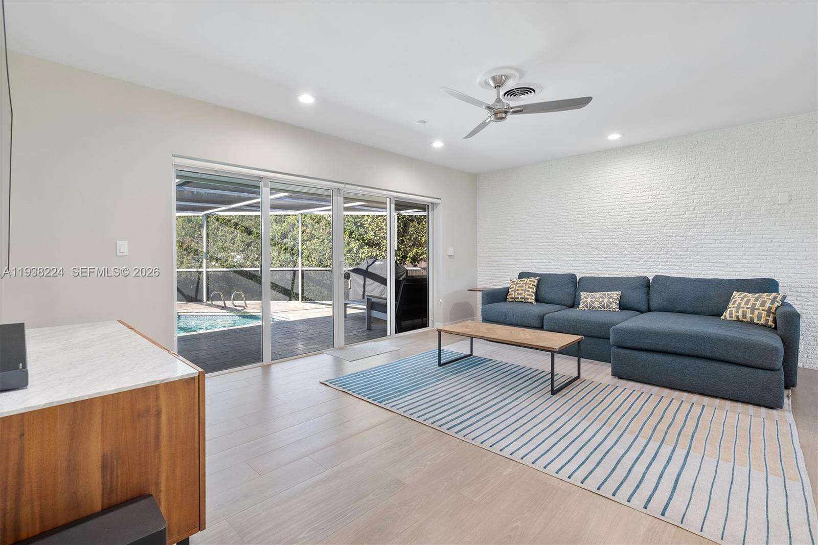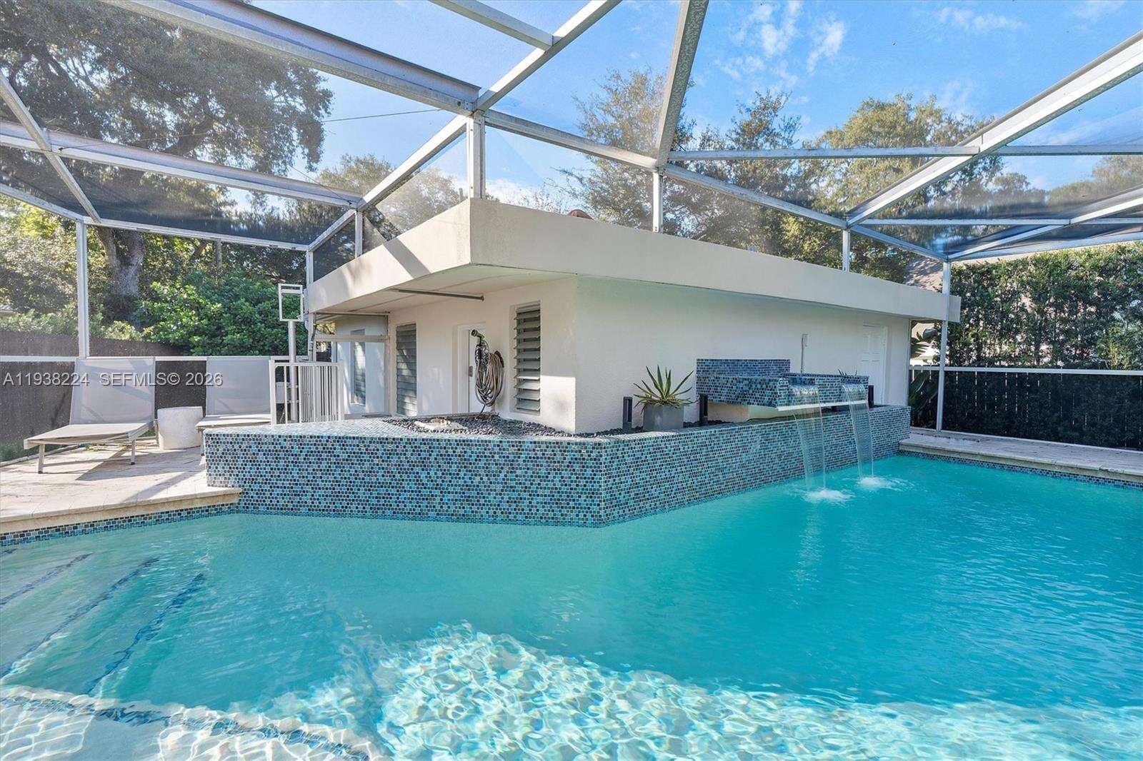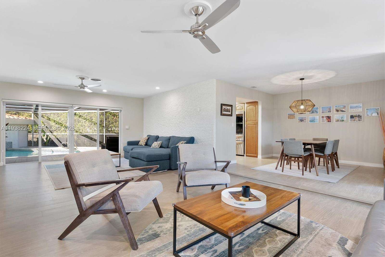 Beautifully reimagined Mid-Century Modern residence located in the highly desirable East Miami Shores neighborhood, just moments from Biscayne Bay. Set on an expansive 8,368 SF lot, this 3-bedroom, 3-bath home seamlessly blends classic architectural character with thoughtful contemporary updates. The light-filled interior features an open, flowing layout with updated flooring throughout, stylishly renovated bathrooms, and a modern kitchen equipped with premium appliances—ideal for both daily living and entertaining. Impact windows enhance comfort and peace of mind, while lush tropical landscaping surrounds the home, creating a sense of privacy and tranquility. Outdoor living shines with a screened-in pool patio designed for year-round enjoyment, offering a true resort-style atmosphere perfect for gatherings or quiet relaxation. A rear-entry two-car garage provides ample storage and presents flexible potential for a guest suite, home office, gym, or creative space. Ideally positioned near top-rated schools, Miami Shores Country Club, golf and tennis facilities, aquatic center, parks, and a variety of shopping and dining destinations—this home offers the perfect balance of luxury, lifestyle, and everyday convenience.
