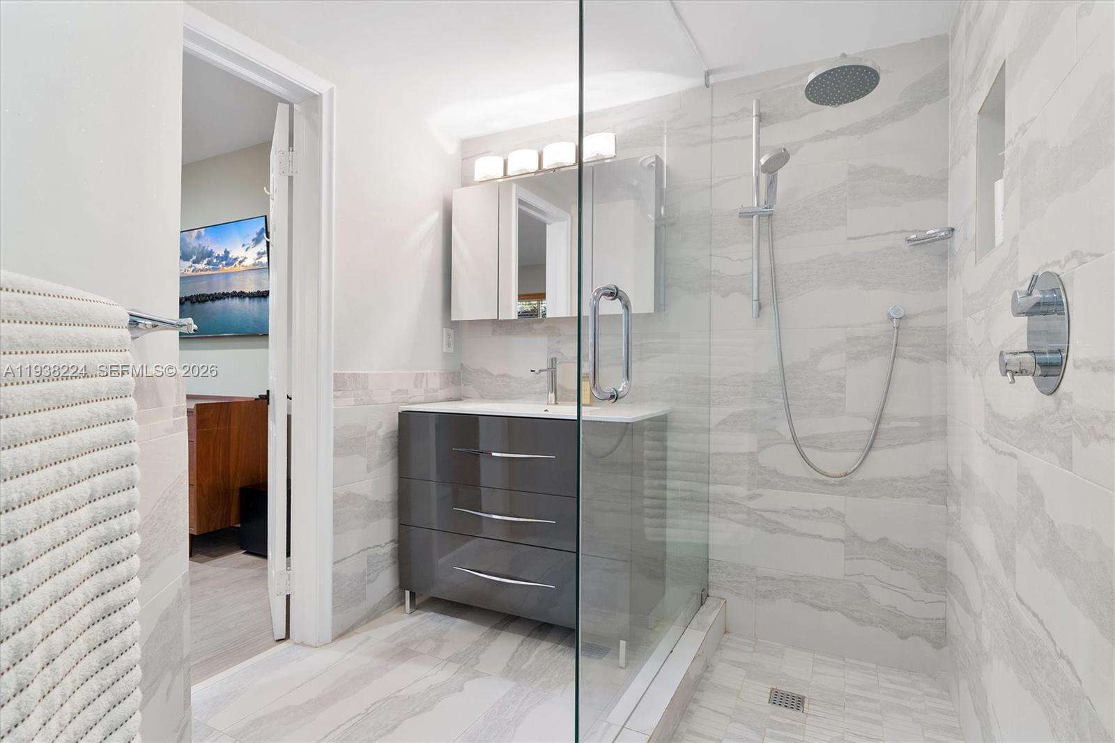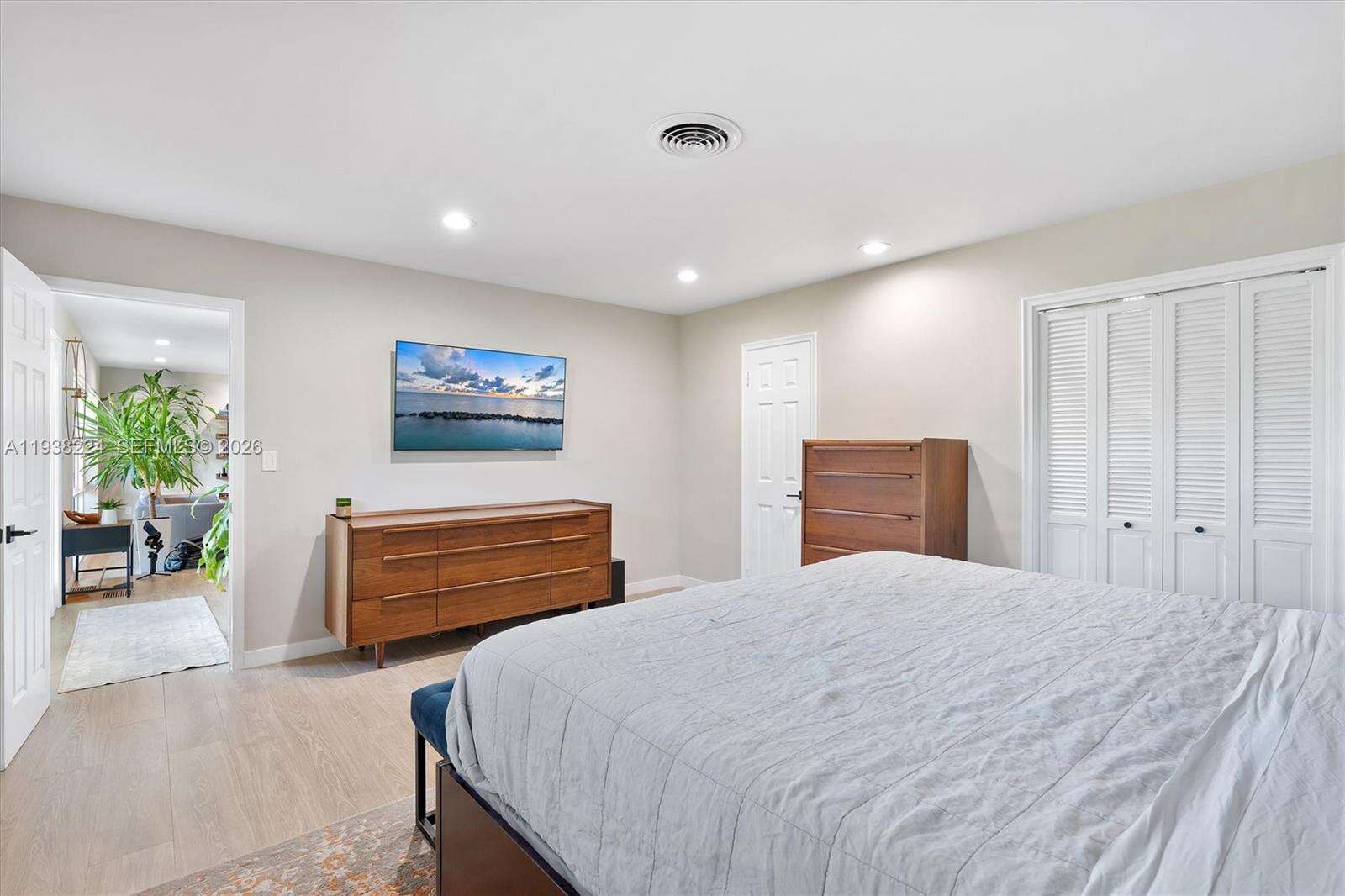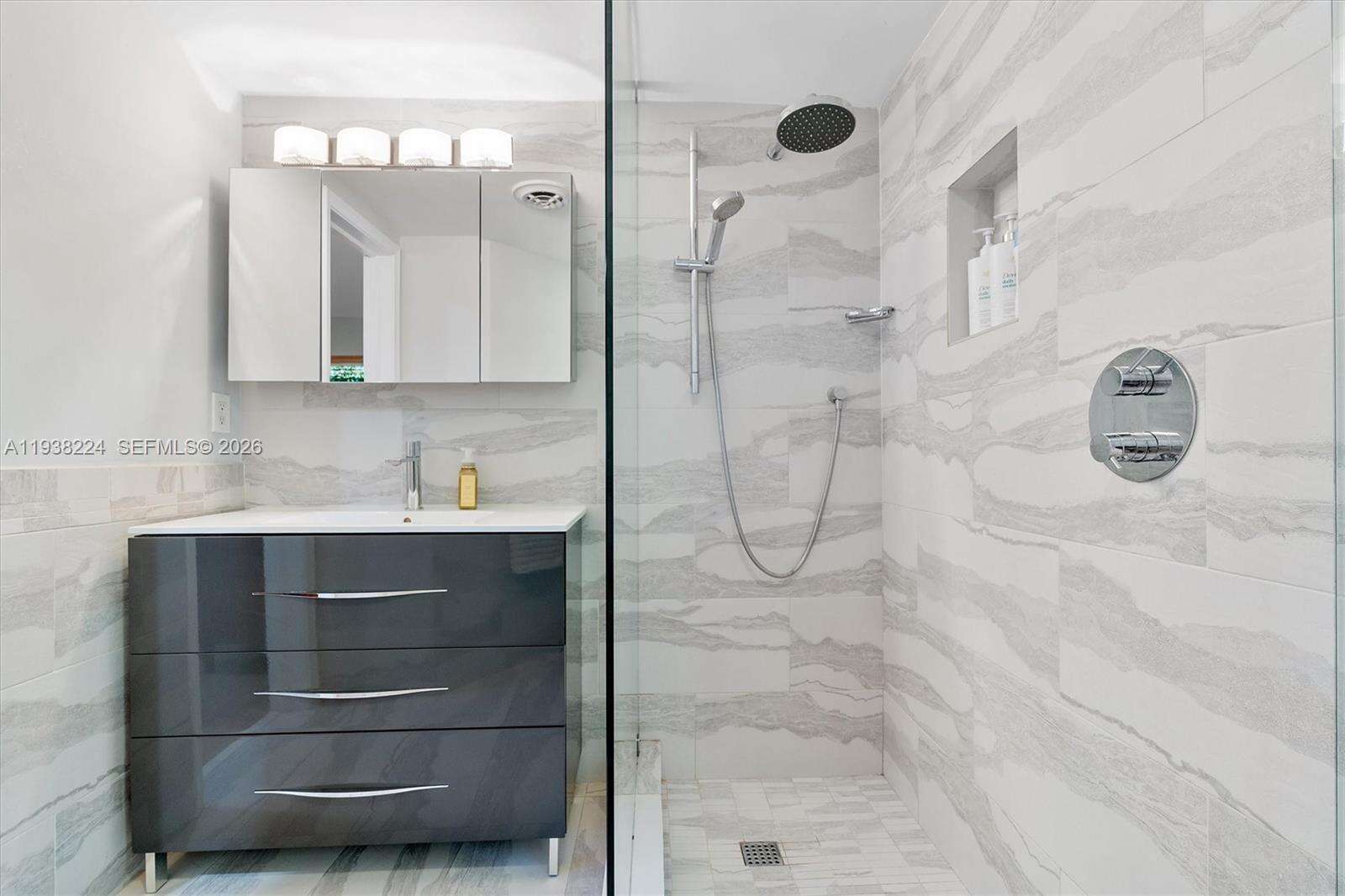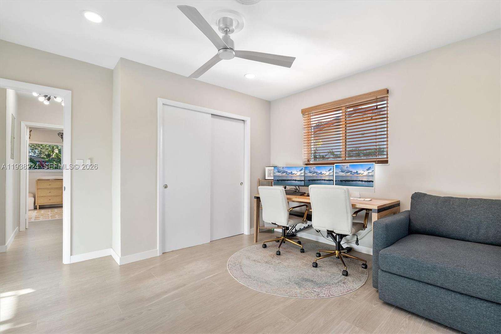 Beautifully reimagined Mid-Century Modern residence located in the highly desirable East Miami Shores neighborhood, just moments from Biscayne Bay. Set on an expansive 8,368 SF lot, this 3-bedroom, 3-bath home seamlessly blends classic architectural character with thoughtful contemporary updates. The light-filled interior features an open, flowing layout with updated flooring throughout, stylishly renovated bathrooms, and a modern kitchen equipped with premium appliances—ideal for both daily living and entertaining. Impact windows enhance comfort and peace of mind, while lush tropical landscaping surrounds the home, creating a sense of privacy and tranquility. Outdoor living shines with a screened-in pool patio designed for year-round enjoyment, offering a true resort-style atmosphere perfect for gatherings or quiet relaxation. A rear-entry two-car garage provides ample storage and presents flexible potential for a guest suite, home office, gym, or creative space. Ideally positioned near top-rated schools, Miami Shores Country Club, golf and tennis facilities, aquatic center, parks, and a variety of shopping and dining destinations—this home offers the perfect balance of luxury, lifestyle, and everyday convenience.
