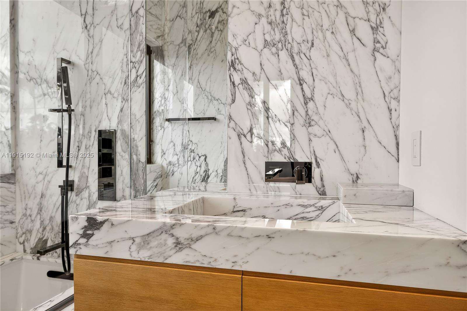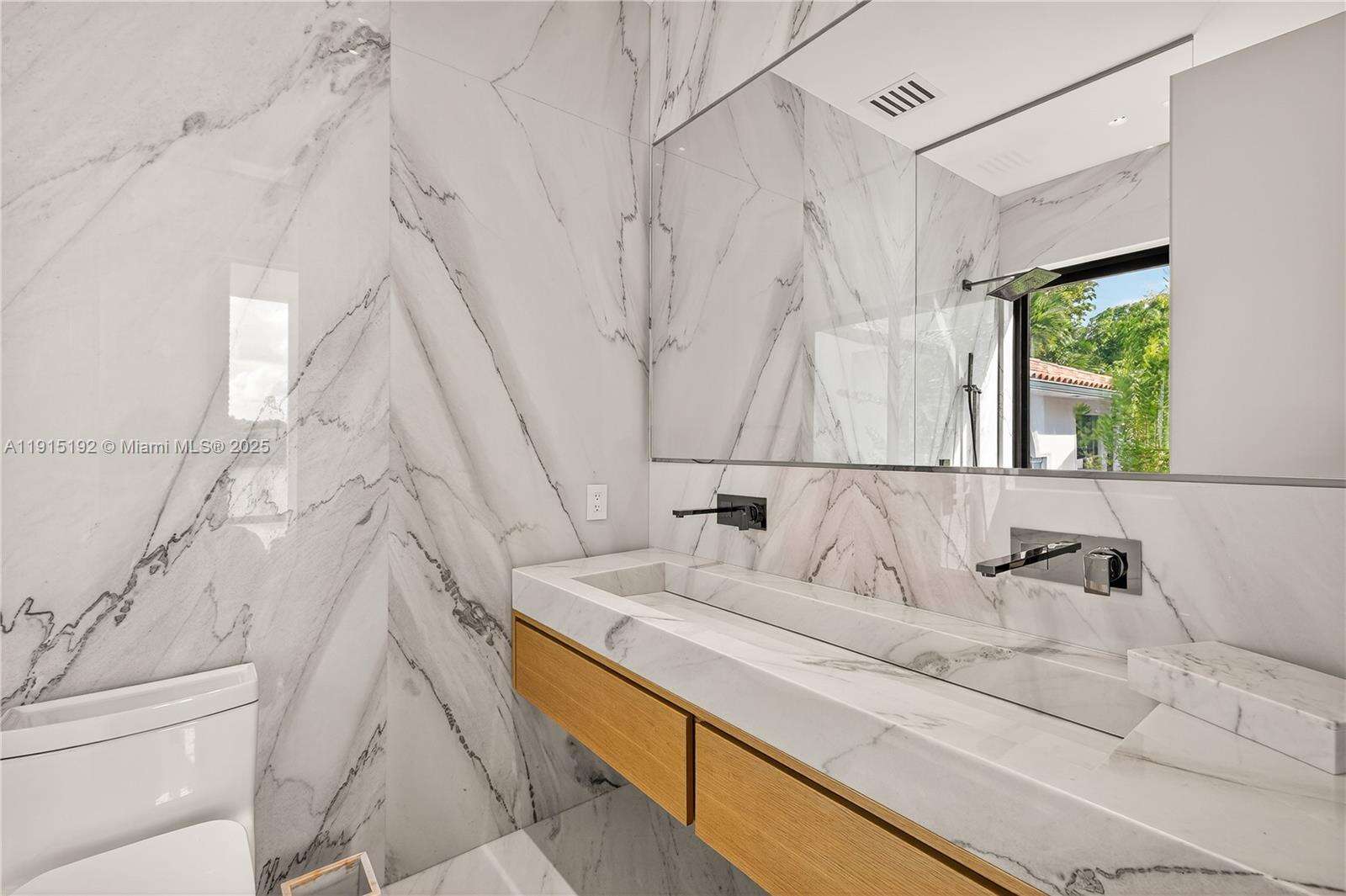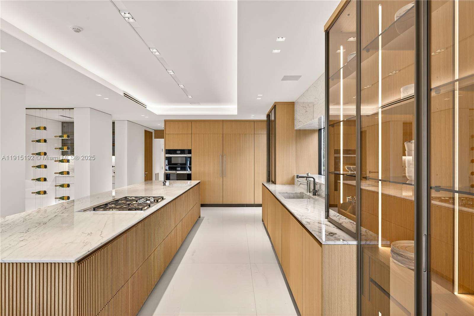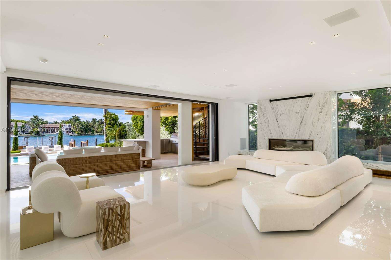 Modern waterfront retreat on gated Hibiscus Island, this residence blends architectural drama with refined comfort & wellness-driven design. Beyond a 23ft steel entry, light-filled living spaces open through telescopic glass walls to sweeping skyline views & spectacular sunsets. The great room centers on a stone fireplace, while the chef’s kitchen features marble & fluted oak finishes, cooking island, illuminated wine wall, Tyent hydrogen system & Control4 automation. Upstairs, a floating staircase leads to 4 beds, including a primary suite with dual lounges, custom dressing room & a spa bath with cold plunge & UV sauna. Outdoors, southern exposure sets a resort tone with a sleek pool & spa, covered lounge, summer kitchen, sunken firepit, 60' of water frontage & reverse-osmosis filtration